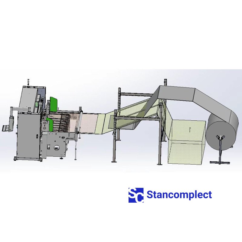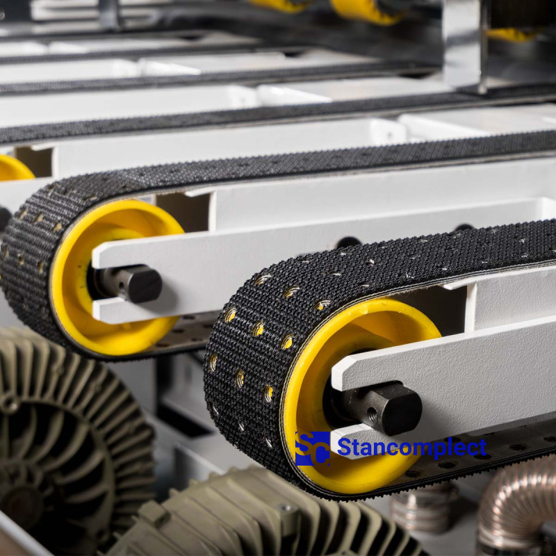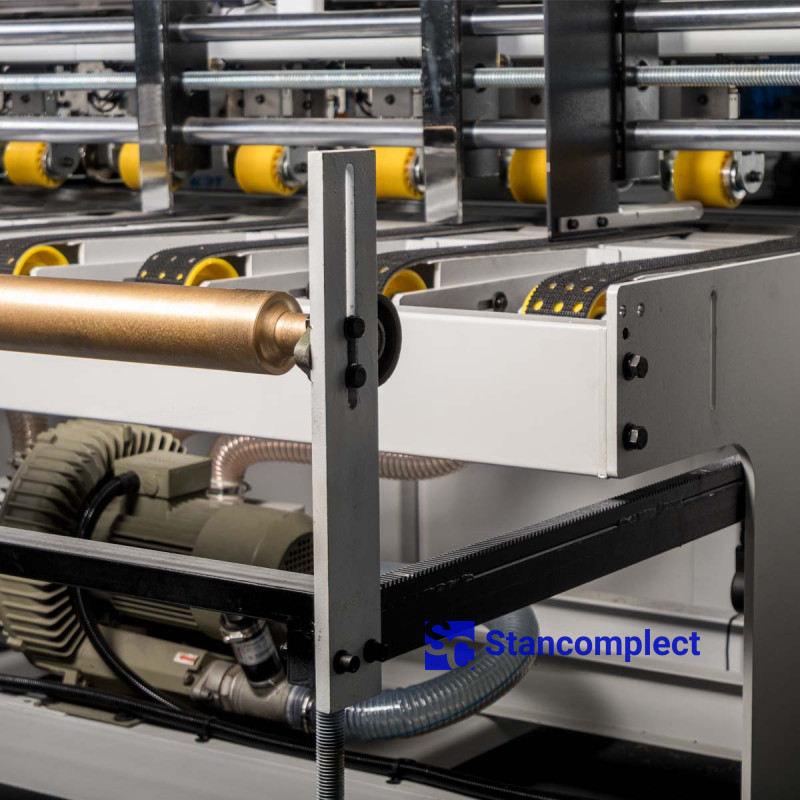 Automatický podávací systém pro vlnité lepenky s vakuovou fixací. Maximální šířka plechu 2400 mm. Maximální tloušťka kartonového obalu je 500 mm.
