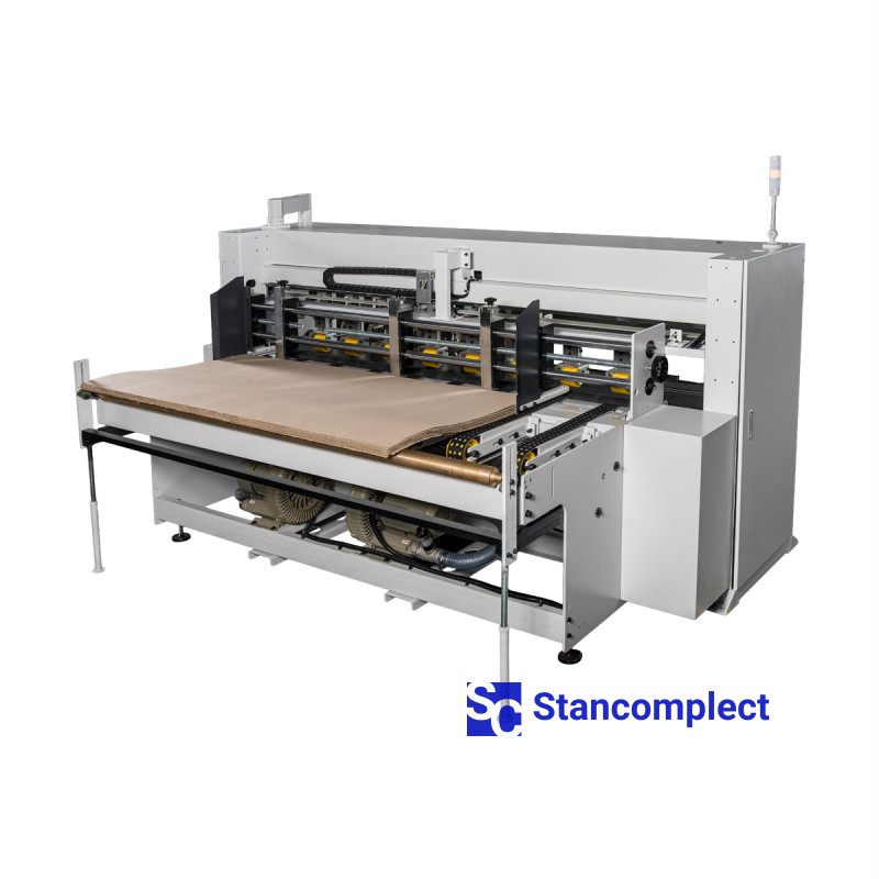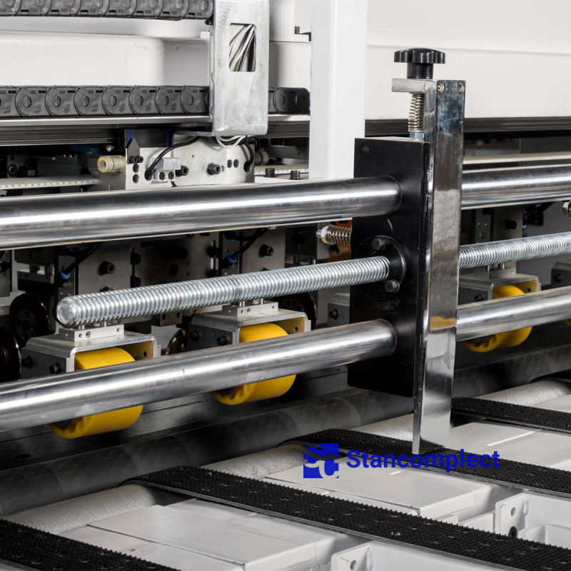 Stroj je vybaven 6 podélnými řezací a rýhovací jednotkami. Každý pár kotoučových nožů současně řeže a rýhuje budoucí krabici v podélném směru.
