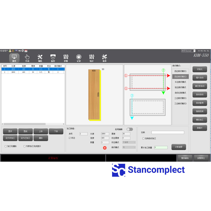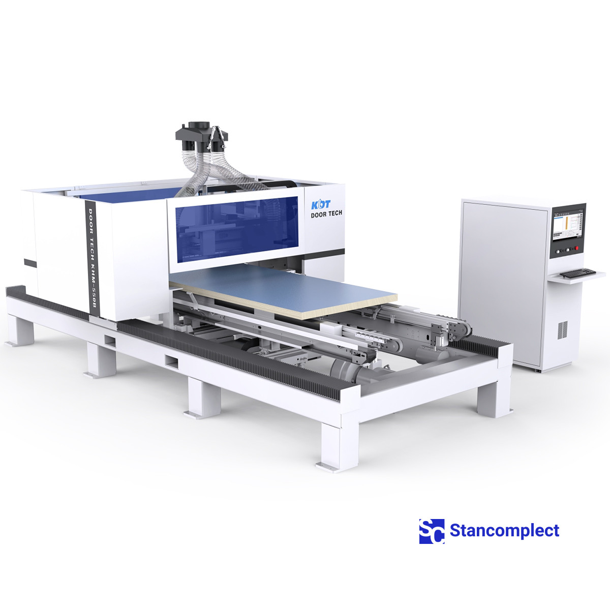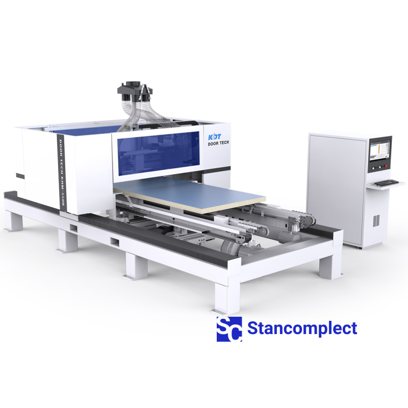 KDT KHM-550B CNC klížecí a ořezávací stroj je určen pro přesné formátování dveřních výplní a dílců výplní ze 4 stran na požadované rozměry v průchozím režimu. Lze zabudovat do automatické linky. Používá se u velkých dveřních podniků při sériové výrobě dveří.