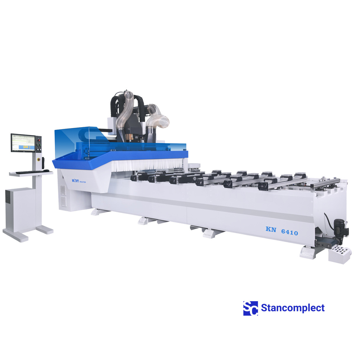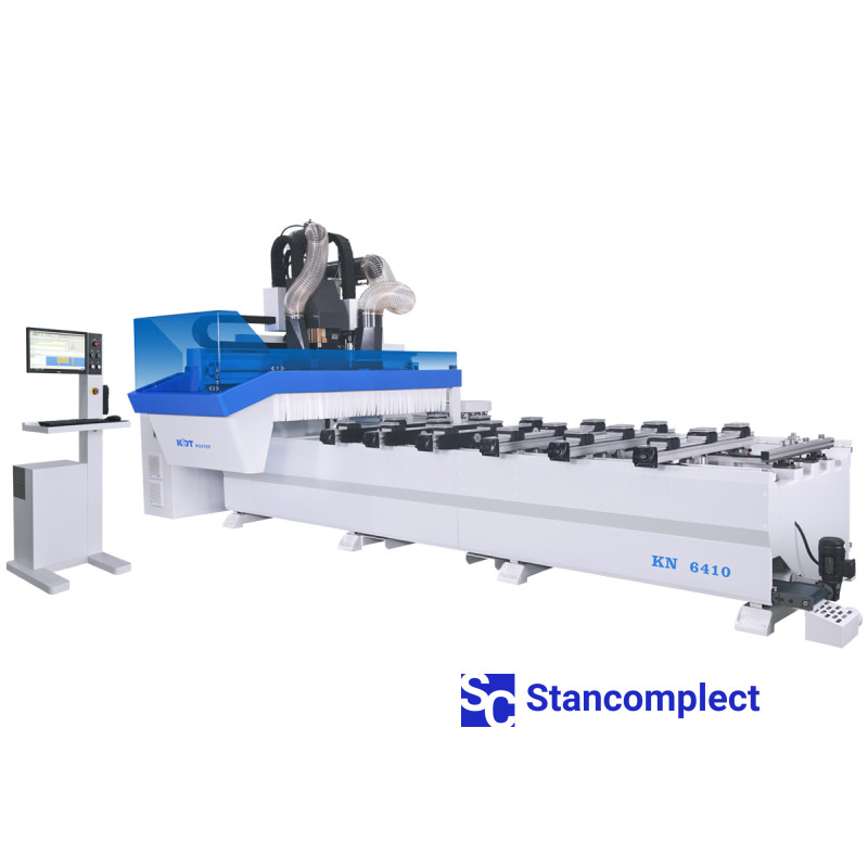 CNC obráběcí centrum KN-6410C se 4-osým obráběním a obráběcí plochou 3250x1250 mm, jedno HSD frézovací vřeteno + vrtací skupina (12 vertikálních vřeten + 8 horizontálních + drážkovací pila), výměna revolverového nástroje na 16 míst od KDT Machinery je určena pro vysoko- rychlostní frézování deskových materiálů (překližka, nábytková deska, dřevotříska, MDF), různých kompozitních materiálů a plastů, stejně jako masivního dřeva měkkých i tvrdých druhů. Stroj lze použít v malosériové i velkosériové výrobě, lze jej integrovat do automatických linek.