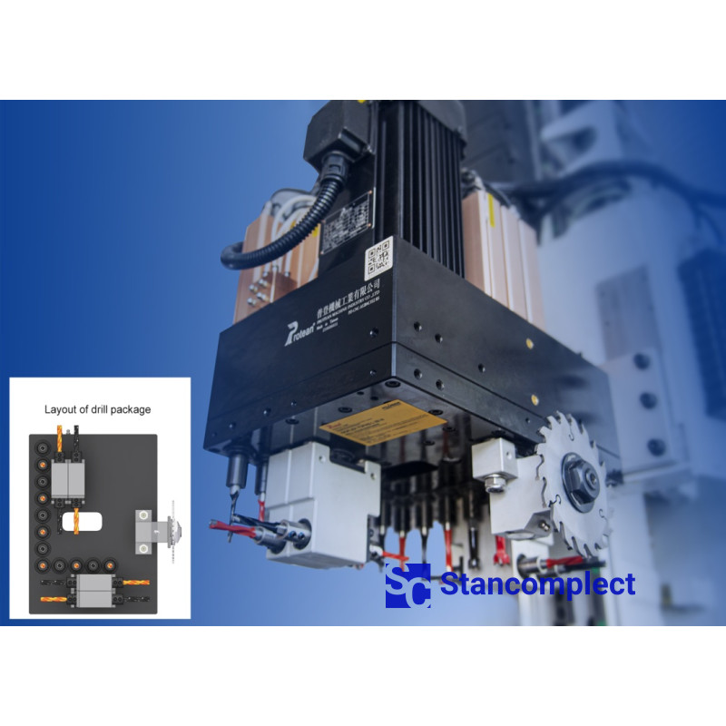 Vrtací skupina HSD (12 vertikálních + 8 horizontálních vřeten + 1 drážkovací pila).