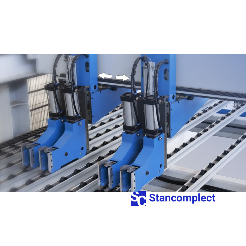 Posouvá dvě levé rukojeti rovnoběžně s linií řezu, aby se zabránilo poškození hran dílů a bezpečně držely díly různých šířek. Programovatelný posunovač je vybaven dvěma skupinami dvojitých chapadel, které se pohybují doleva a doprava, 1 standardním chapadlem posunovače, pěti dvouprstými pneumatickými chapadly, což zaručuje spolehlivou fixaci balíku obrobků. Příchytky spolehlivě fixují jak balík materiálu do tloušťky 120 mm, tak jeden list.