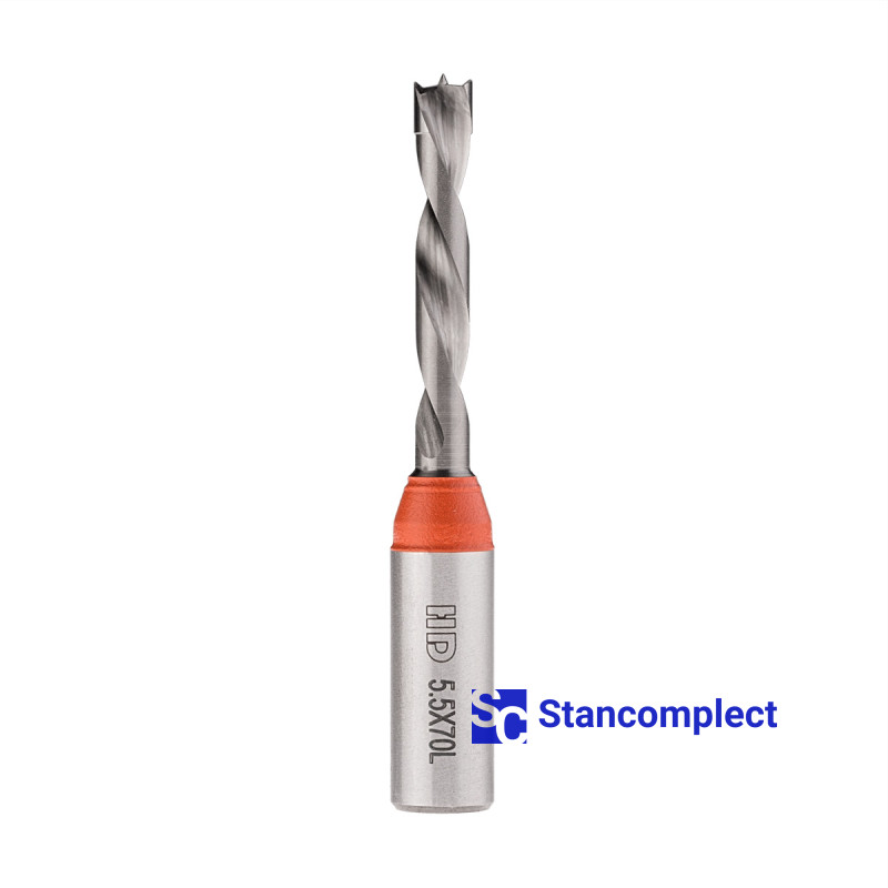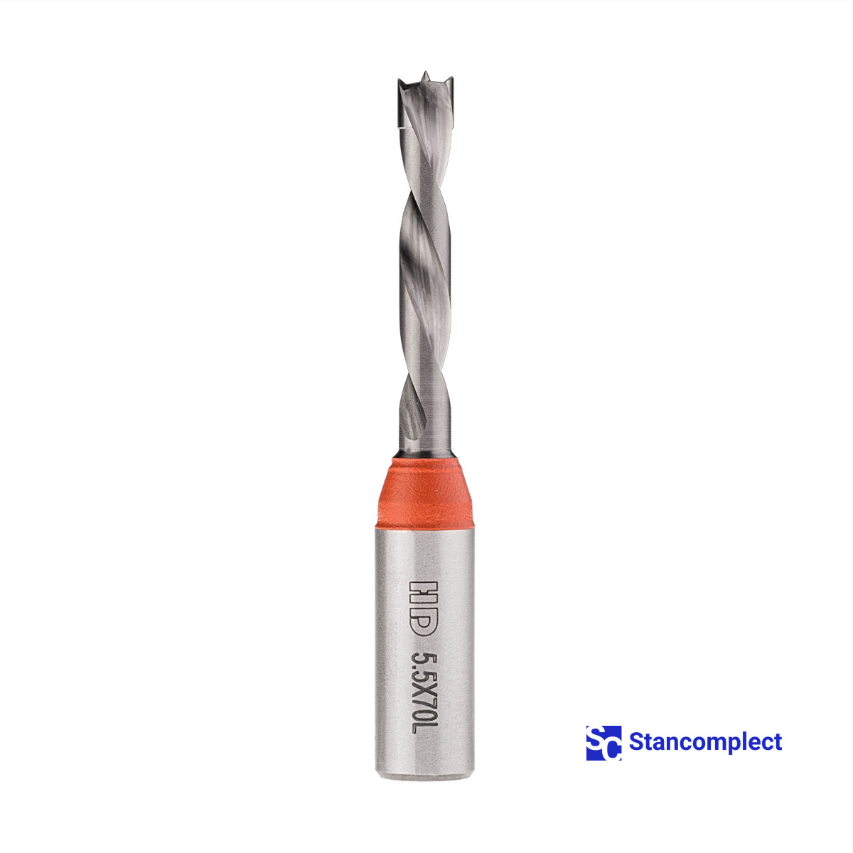 Kolíkovací vrták neprůchozí celotvrdokov HD d-5,5 mm, L-70 mm levý (série 301). Tento vrták je vynikající pro vrtání slepých otvorů do obrobků z: MDF, dřevotřískové desky, dřevotřísky, masivního dřeva, měkkého dřeva a překližky.