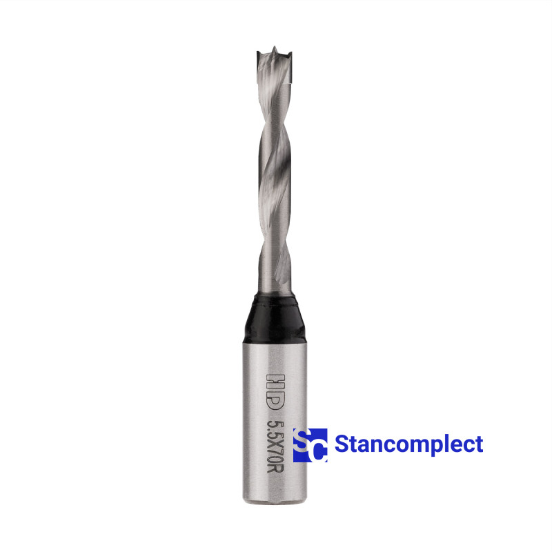 Kolíkovací vrták neprůchozí celotvrdokov HD d-5,5 mm, L-70 mm pravý (série 301). Tento vrták je vynikající pro vrtání slepých otvorů do obrobků z: MDF, dřevotřískové desky, dřevotřísky, masivního dřeva, měkkého dřeva a překližky.