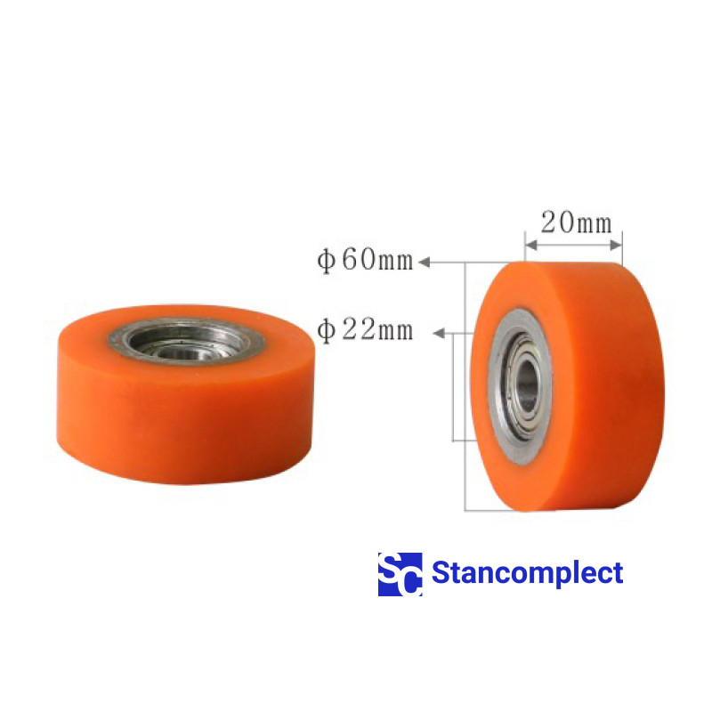 Přítlačný válec pro obalovací stroj U-528 rozměr 60x22x20 s hřídelí. Válce se používají na strojích pro laminování (obalování) profilů z MDF, masivního dřeva, dřevotřísky, plastu, hliníku atd. s válcovanými dokončovacími materiály, jako je dekorační papír, dýha.