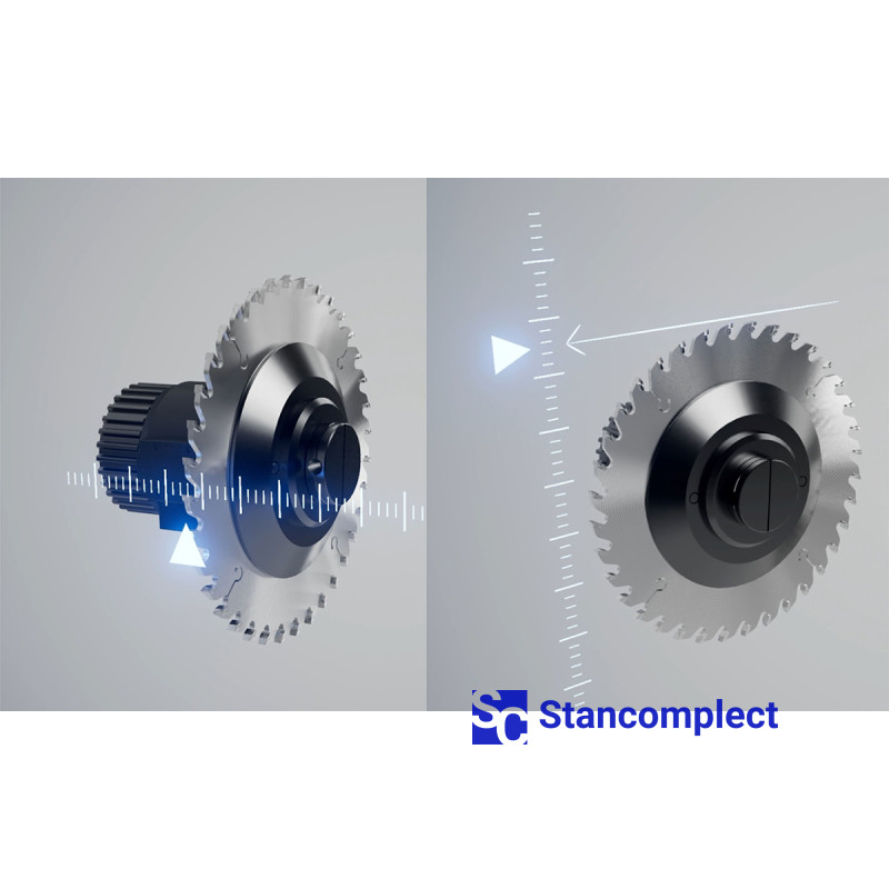 Pohyb pilového vozíku se uskutečňuje díky ozubené tyči a pastorku pomocí servomotoru. To zajišťuje větší přesnost řezání až +-0,1 mm.