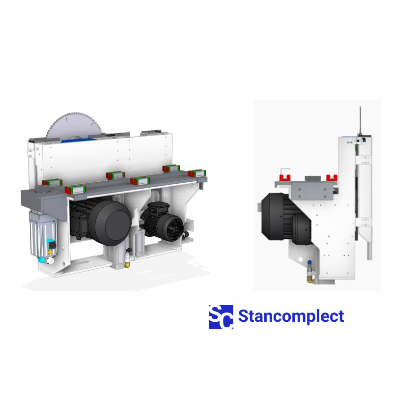 Stroj je vybaven dvěma pilovými vozíky - v podélném a příčném řezu. Hlavní (30 kW) a předřezávací (2,2 kW) pila jsou instalovány na každém ze dvou vozíků. Vozík se pohybuje pomocí servopohonu a dvou lineárních vedení se 6 opěrnými body (lineární ložiska) s automatickým mazáním. Rychlost posuvu se nastavuje automaticky v závislosti na výšce balíku obrobků díky frekvenčnímu měniči.