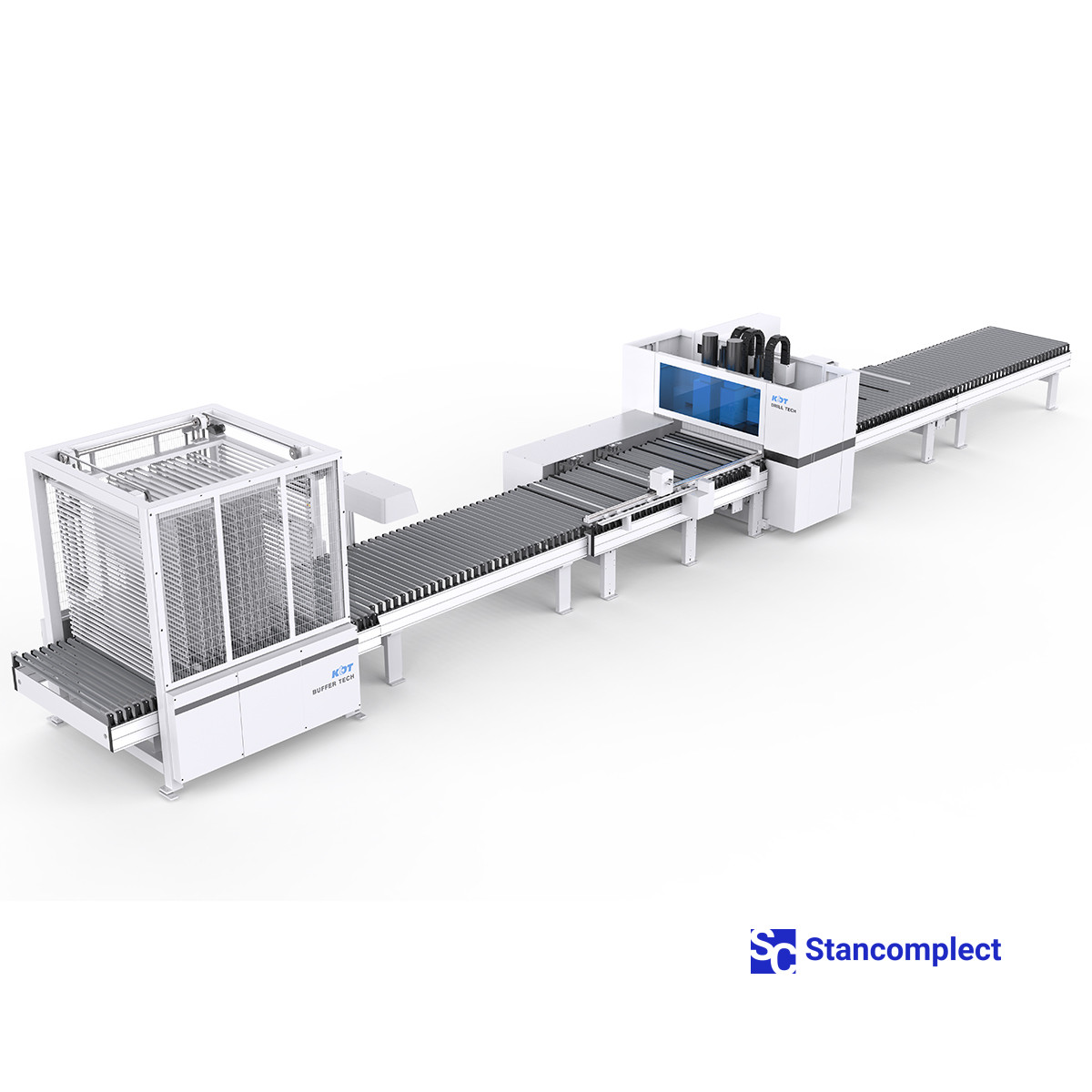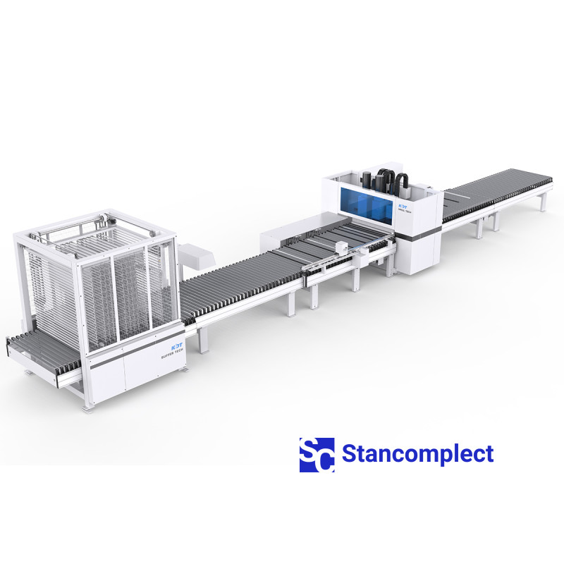 The positioning of the workpiece on the machine is carried out thanks to the automatic lateral alignment. After reading the barcode, the side aligner moves as close as possible to the dimensions of the part. The workpiece rests on the zero point along the X axis, and the side leveler positions it along the Y axis. Then two pneumatic grippers take the workpiece into the working area of the machine for further processing.
