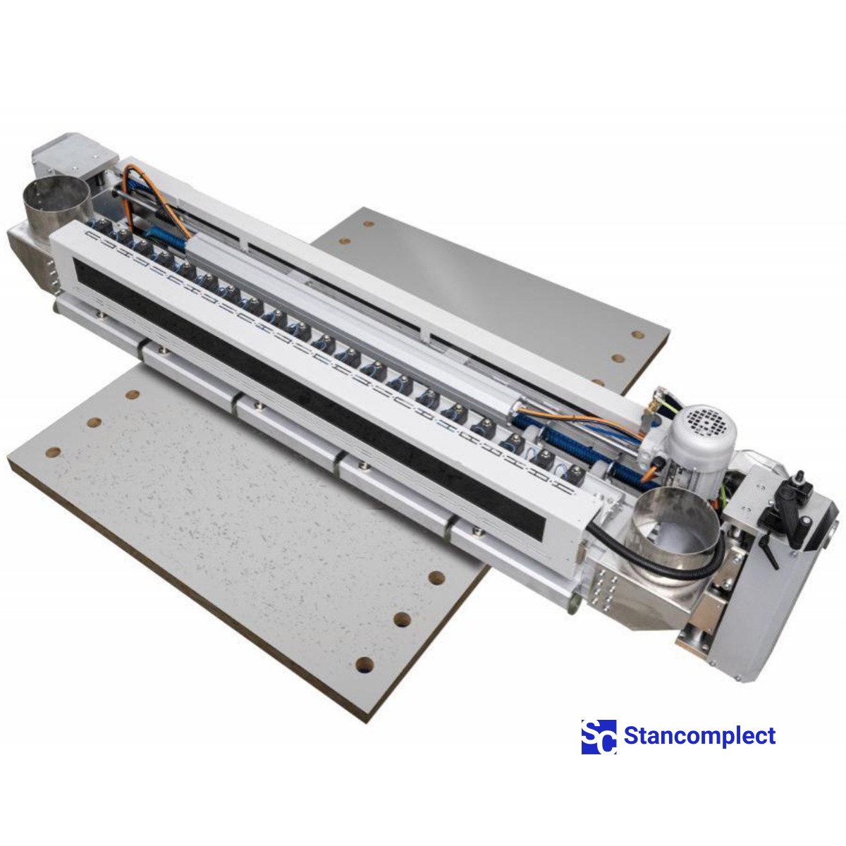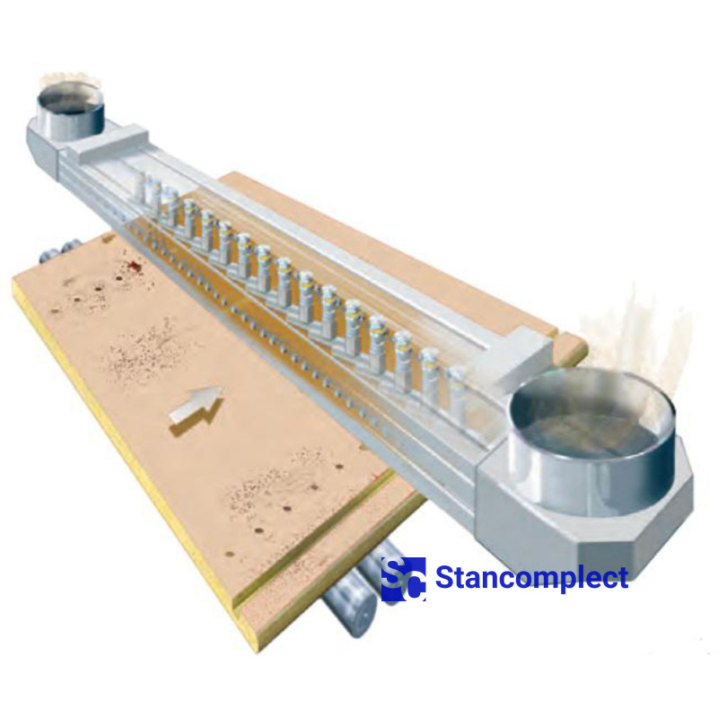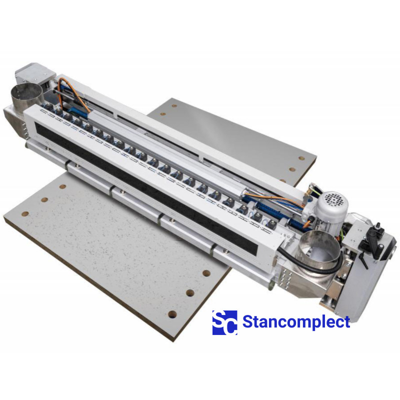 Automatic system for cleaning parts after drilling, grooving and edge banding. It is produced in two versions - for parts with a width of 1000 and 1400 mm.
