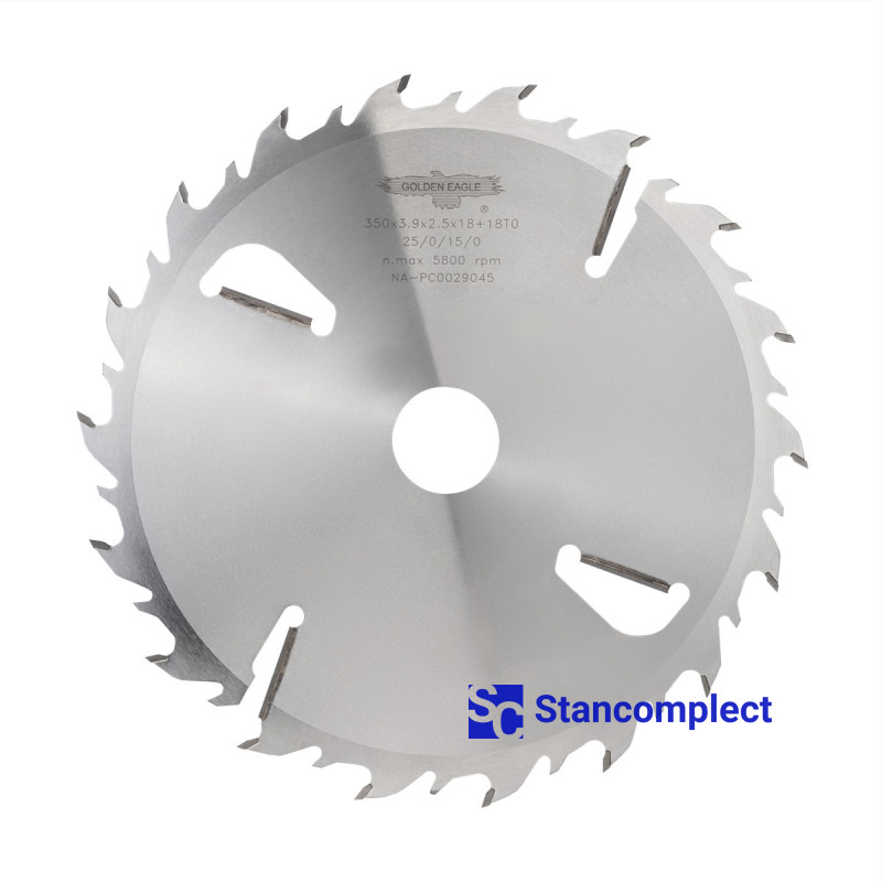 Multi rip saw blade Golden Eagle 350x50x3.9/2.5 z18+4 FS with carbide tips is designed for longitudinal cutting of dry, wet and frozen wood.
