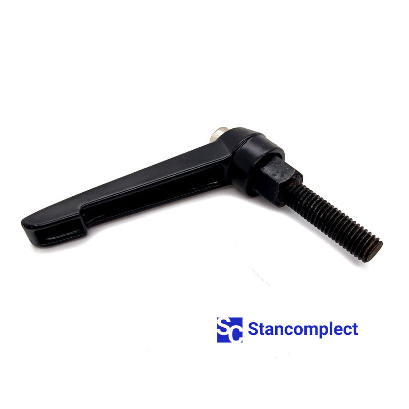 Adjustable clamping handle M10x35 with external thread . Clamping handles are designed to hold or maintain tension on individual parts and assemblies. The high torque is generated by pulling the linkage. Raising the handle with the metal bolt pressed down releases the spacers, allowing the handle to be rotated to the required angle. By lowering the handle, you can continue screwing the handle. With the handle disabled, a metal bolt can be screwed into an object using a hex socket. The safety handle returns it to its original position. Clamping levers of this type can be screwed on or rotated by pressing the handle. The handle will automatically deactivate when it returns to its original position.