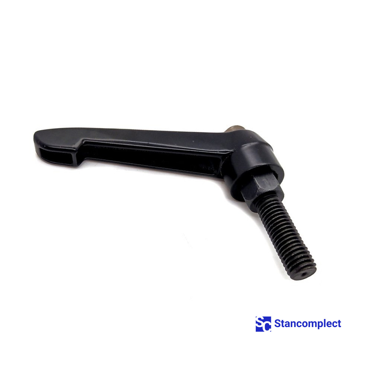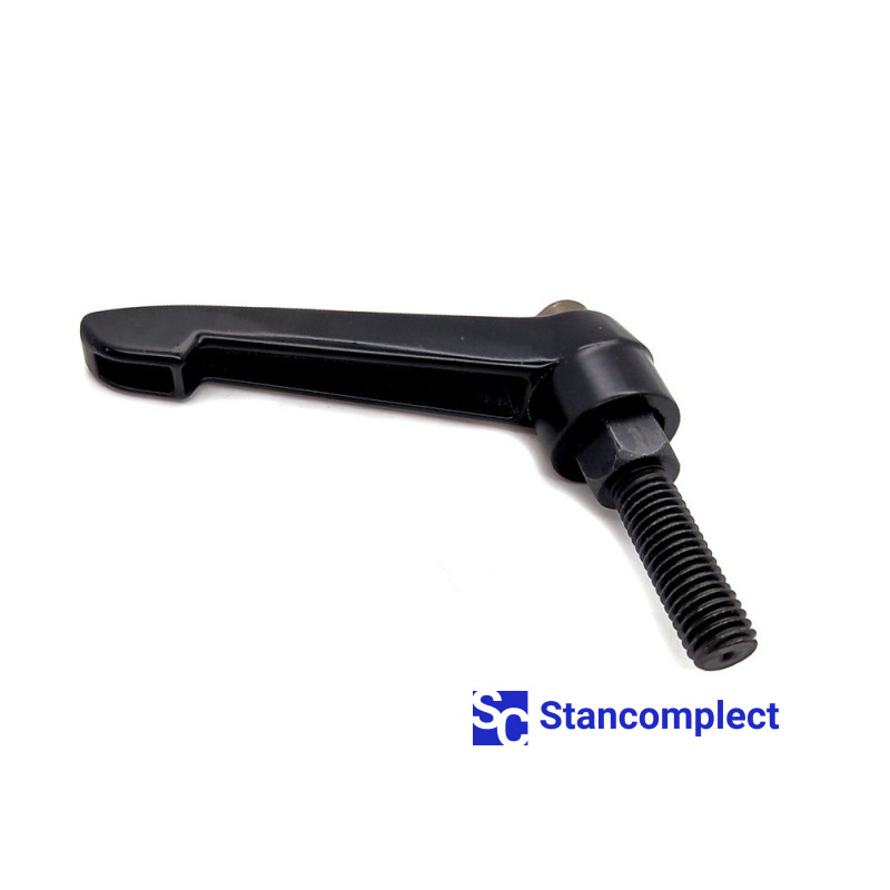 Adjustable clamping handle M12x30 with external thread . Clamping handles are designed to hold or maintain tension on individual parts and assemblies. The high torque is generated by pulling the linkage. Raising the handle with the metal bolt pressed down releases the spacers, allowing the handle to be rotated to the desired angle. By lowering the handle, you can continue screwing the handle. With the handle disabled, a metal bolt can be screwed into an object using a hex socket. The safety handle returns it to its original position. Clamping levers of this type can be screwed on or rotated by pressing the handle. The handle will automatically deactivate when it returns to its original position.