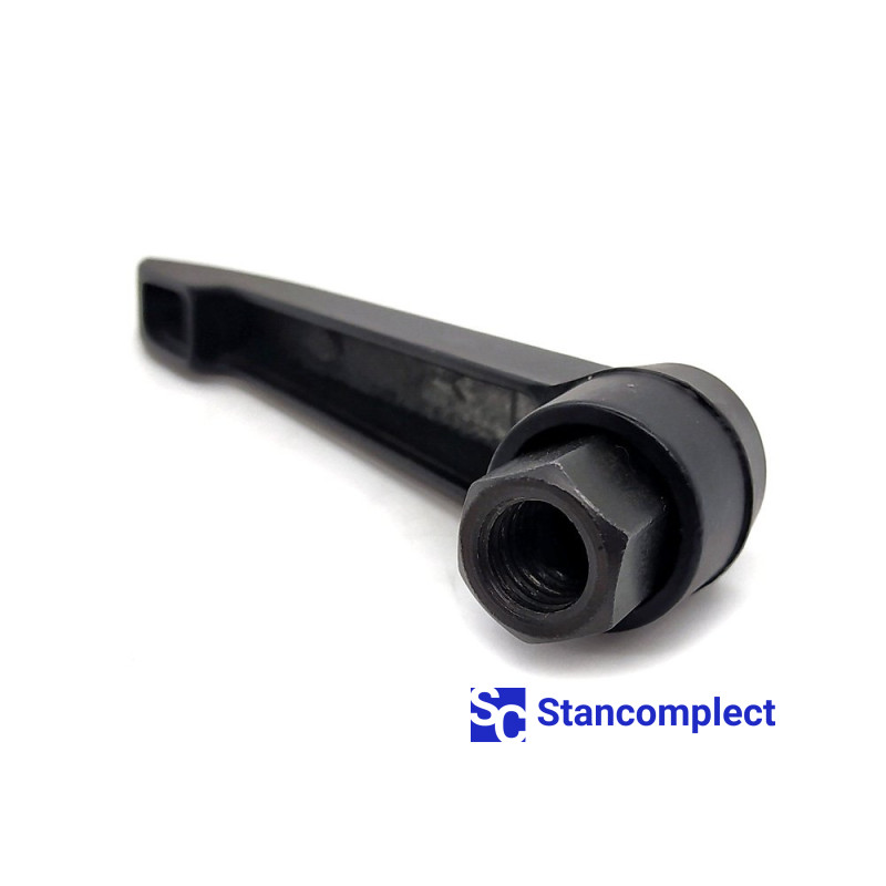 Adjustable clamping handle M8 with internal thread . Clamping handles are designed to hold or maintain tension on individual parts and assemblies. The high torque is generated by pulling the linkage. Raising the handle with the metal bolt pressed down releases the spacers, allowing the handle to be rotated to the required angle. By lowering the handle, you can continue screwing the handle. With the handle disabled, a metal bolt can be screwed into an object using a hex socket. The safety handle returns it to its original position. Clamping levers of this type can be screwed on or rotated by pressing the handle. The handle will automatically deactivate when it returns to its original position.