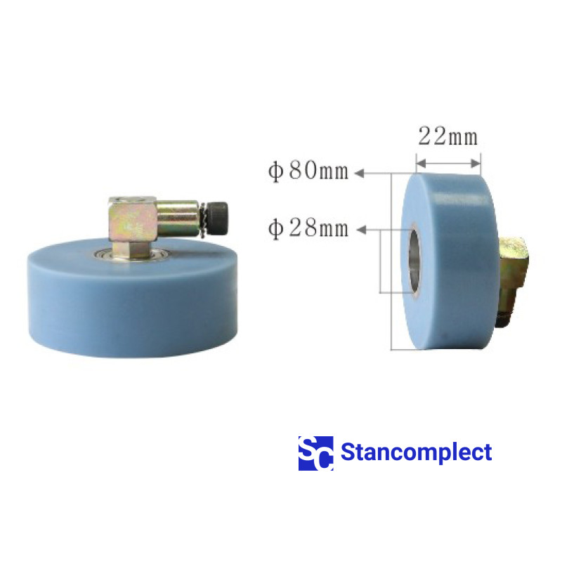 Pressure roller for profile wrapping machine U-504 size 80x22x28 with shaft. The rollers are used on machines for laminating (wrapping) profiles made of MDF, solid wood, chipboard, plastic, aluminum, etc. with rolled finishing materials, such as decorative paper, veneer.