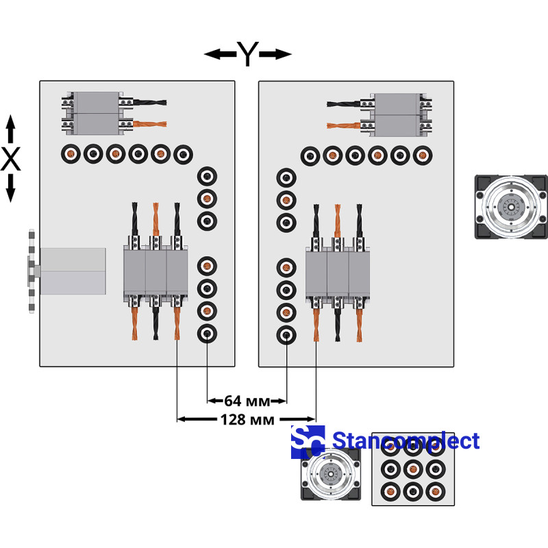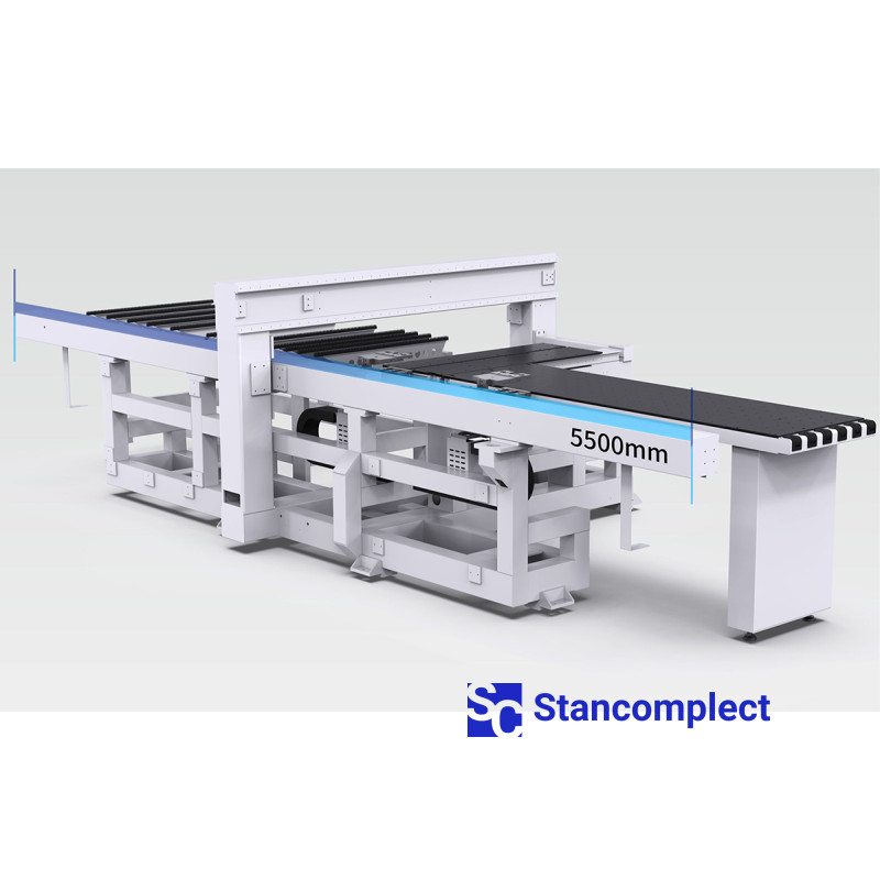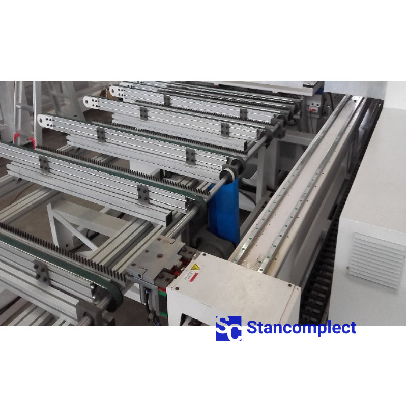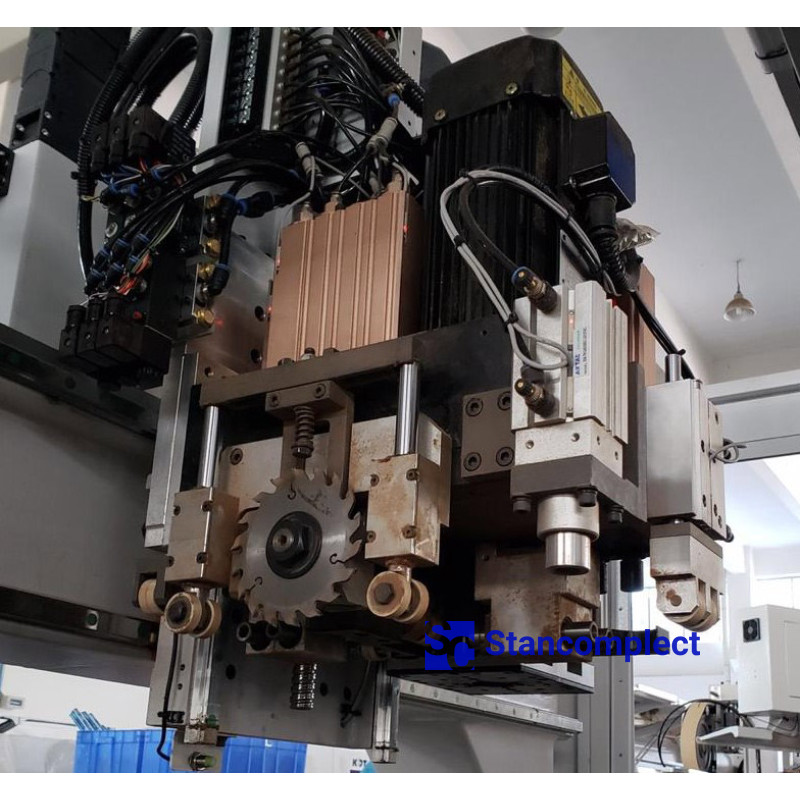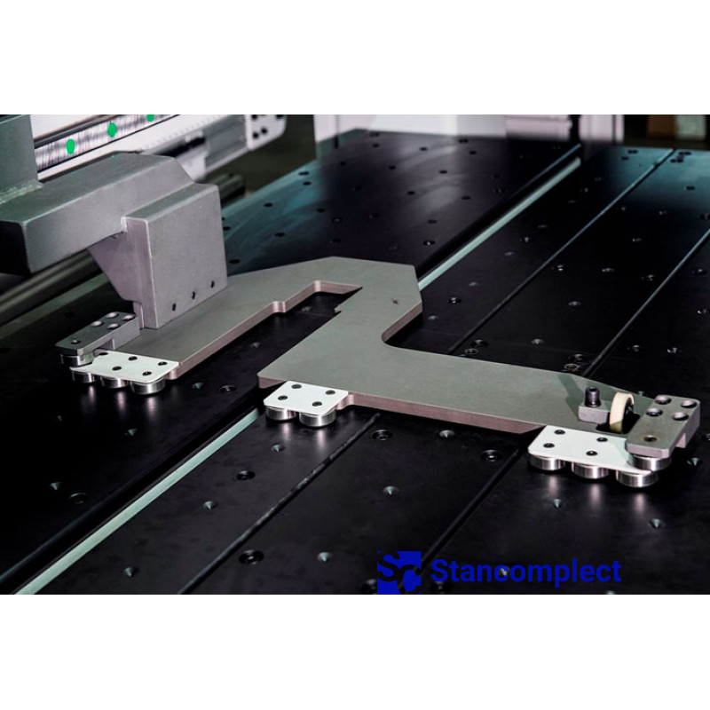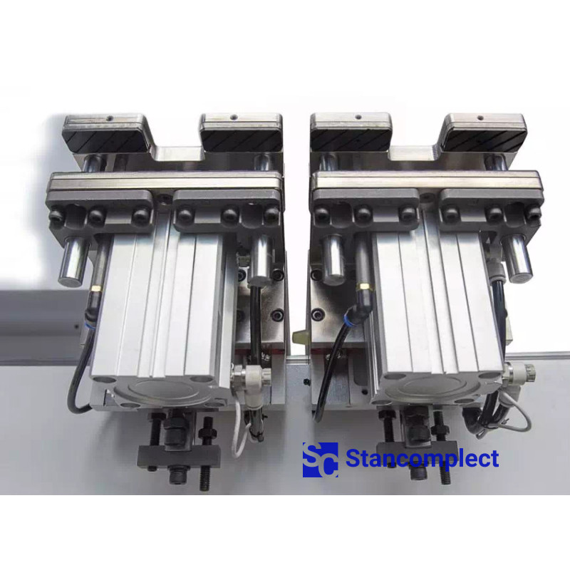 The machine is equipped with two powerful positioning clamps that move the workpiece along the X axis relative to the drilling axis. The movement of the clamps takes place on prismatic guides, which makes it possible to reach a travel speed of 140 m/min.