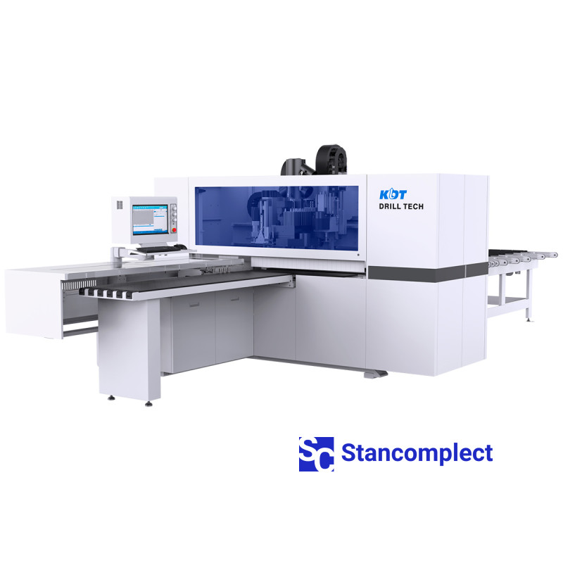 CNC drilling center KD-612THZ with four drilling groups from the top and bottom (milling + grooving saw) for drilling from 6 sides (workpiece size 1200x2800 mm), two milling spindles and linear tool change for 5 positions from KDT Machinery is designed for high-precision drilling of blind and through holes in the planes and ends of furniture parts in the through mode, according to a given additive map. The machine is equipped with two milling units for milling both simple straight grooves, such as a groove for the back wall or the bottom of a box, and profiling.