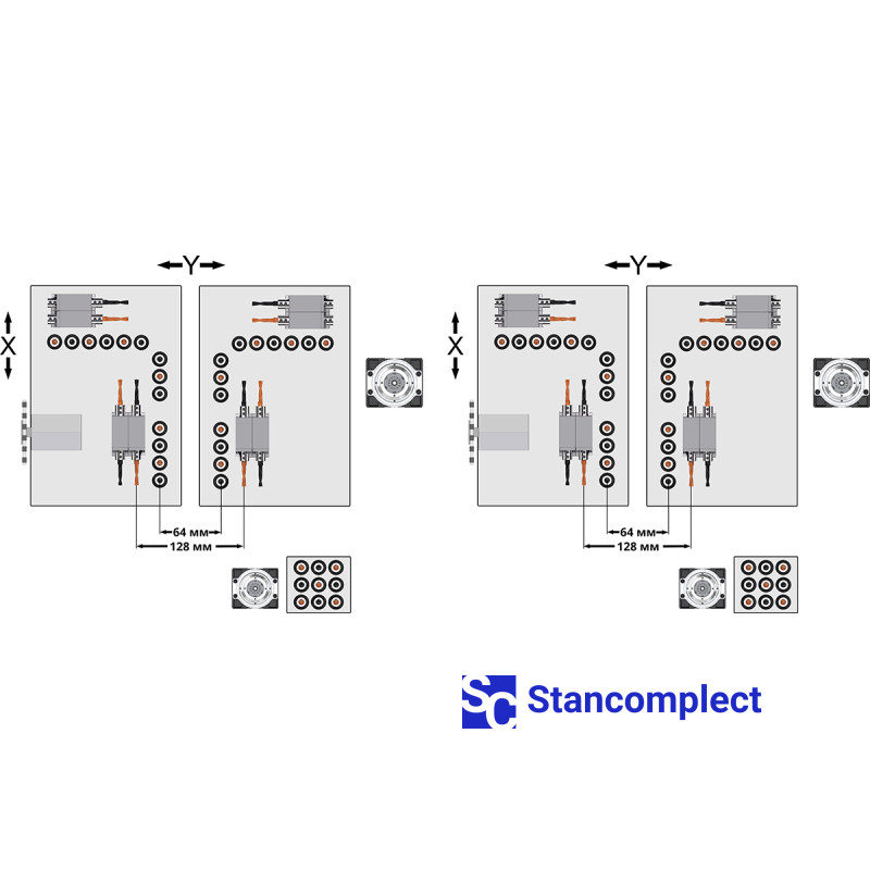 - 3 drilling groups (2 top + 1 bottom) on each table;