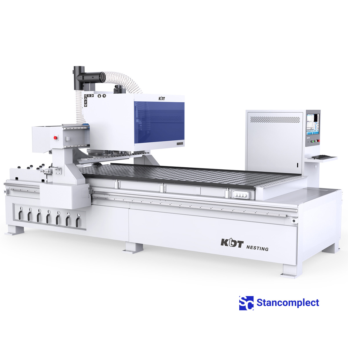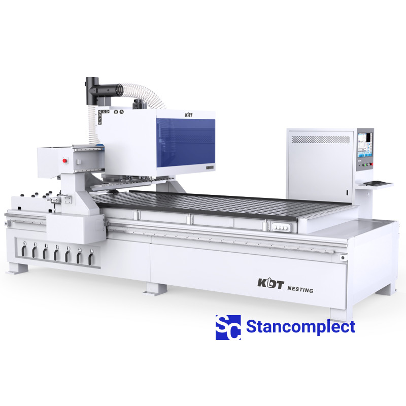 CNC machining center KN-2409LP with a processing area of 2850x1220 mm, one KDT milling spindle and 12-position linear tool changer from KDT Machinery is designed for high-speed milling of sheet materials (plywood, furniture board, laminated chipboard, MDF), various composite materials and plastics, as well as solid wood of soft and hard species. The machine can be used in small-batch and large-batch production, it can be integrated into automatic lines.