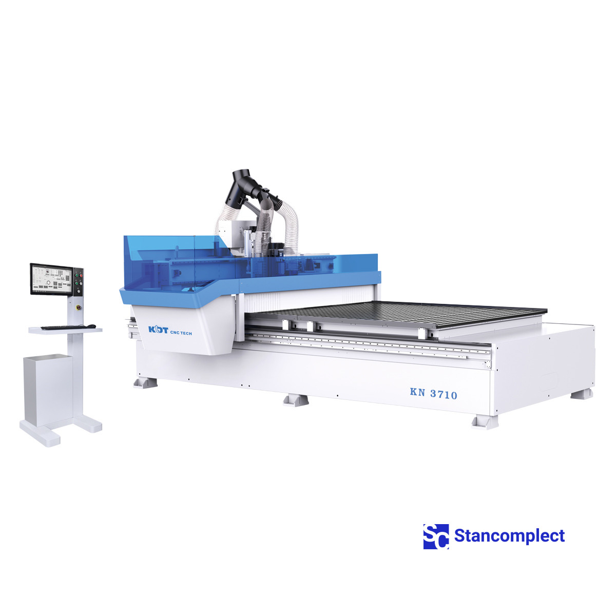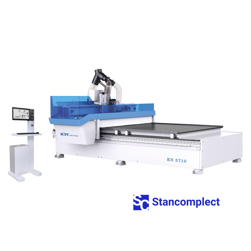 CNC machining center KN-3710DP with a processing area of 3100x2150 mm, one HSD milling spindle and a 16-station servo-driven tool changer and a drilling head for 10 vertical spindles with manual tool change from KDT Machinery is designed for high-speed milling of sheet materials (plywood, furniture board, laminated chipboard, MDF), various composite materials and plastics, as well as solid wood of soft and hard species. The machine can be used in small-batch and large-batch production, it can be integrated into automatic lines.