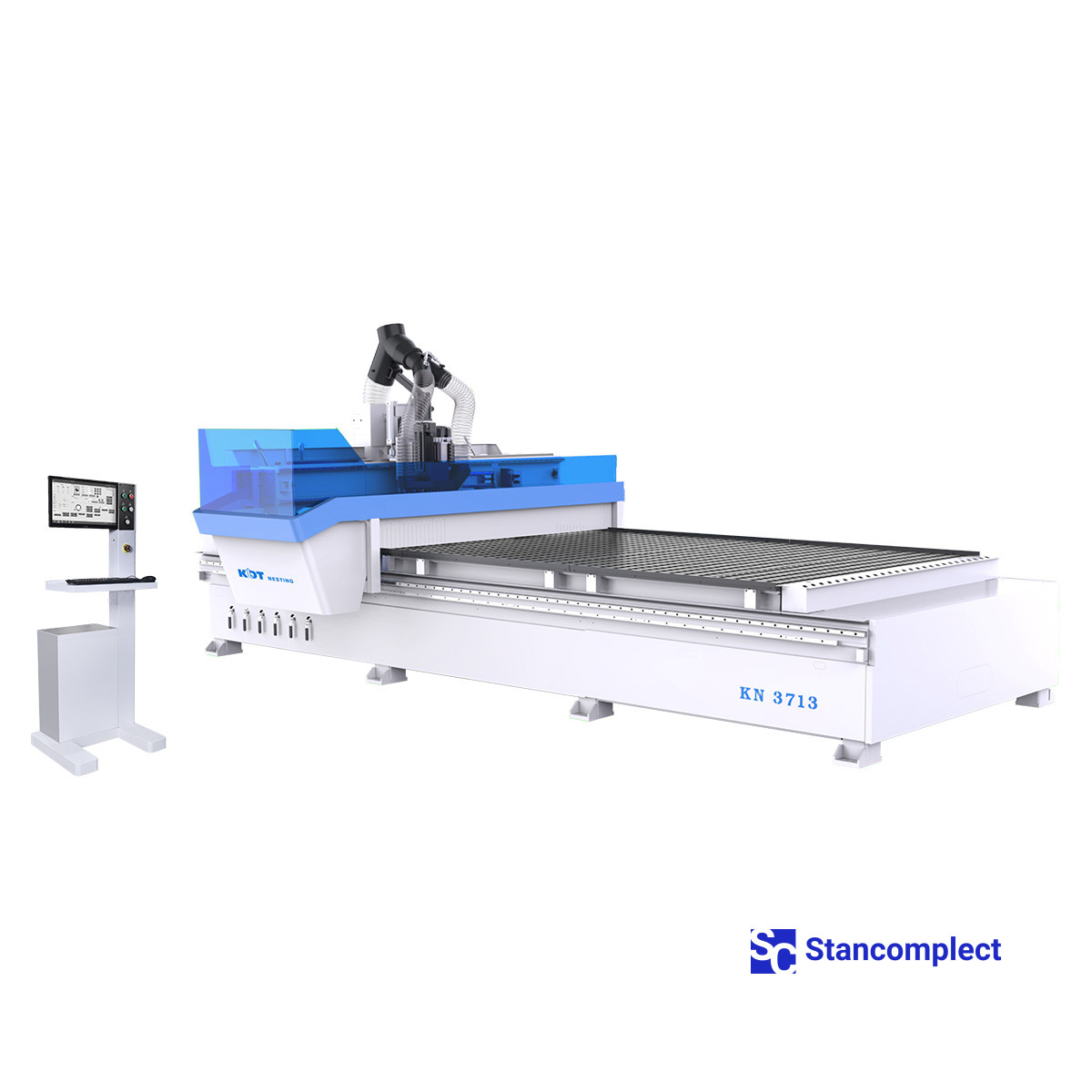 CNC machining center KN-3713DE with a processing area of 4260x2150 mm, one KDT milling spindle and a servo-driven tool changer for 12 places and a drilling head for 10 vertical spindles with manual tool change from KDT Machinery is designed for high-speed milling of sheet materials (plywood, furniture board, laminated chipboard, MDF), various composite materials and plastics, as well as solid wood of soft and hard species. The machine can be used in small-batch and large-batch production, it can be integrated into automatic lines.