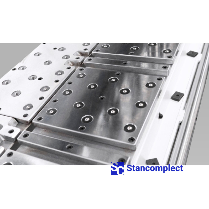 The programmable pusher is equipped with eight two-finger pneumatic grippers, which guarantees a secure fixation of the workpiece package.