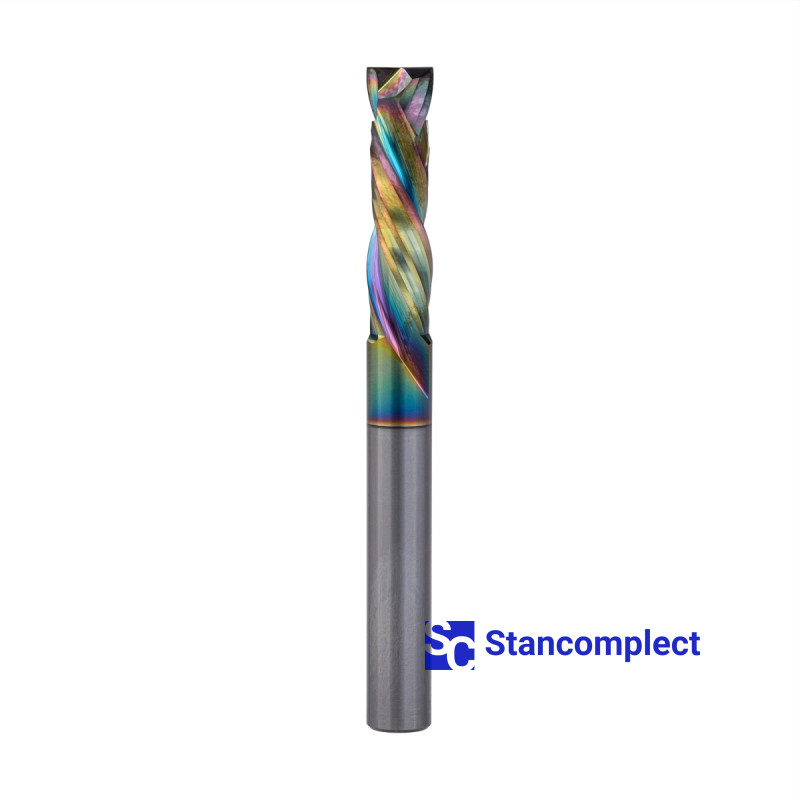 Compression router bit with AlTiN coating 10x40x100 mm for CNC machines for wood. Thanks to multidirectional cutting edges, this compression bit tolerates high loads and cutting speeds well. As a rule, it is used for contour cutting, 2D sampling (grooving, quarters, recesses for mortise fittings, etc.), as well as for giving workpieces any geometric shape. The main direction is plywood processing. Not afraid to work with MDF, chipboard, soft woods.