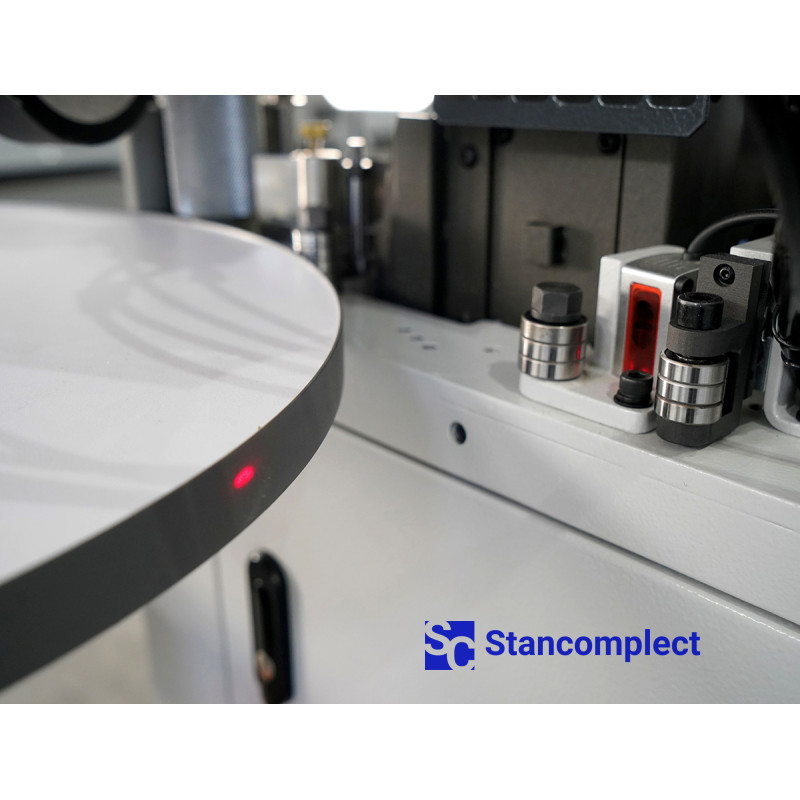 - An optical sensor monitors changes in the workpiece's shape (turns, angles, straight sections), thereby decreasing or increasing the workpiece feed rate. This increases the efficiency of the entire machine and the quality of edge processing.