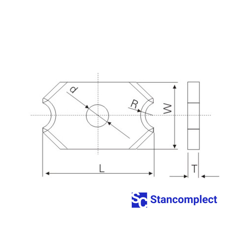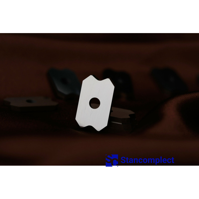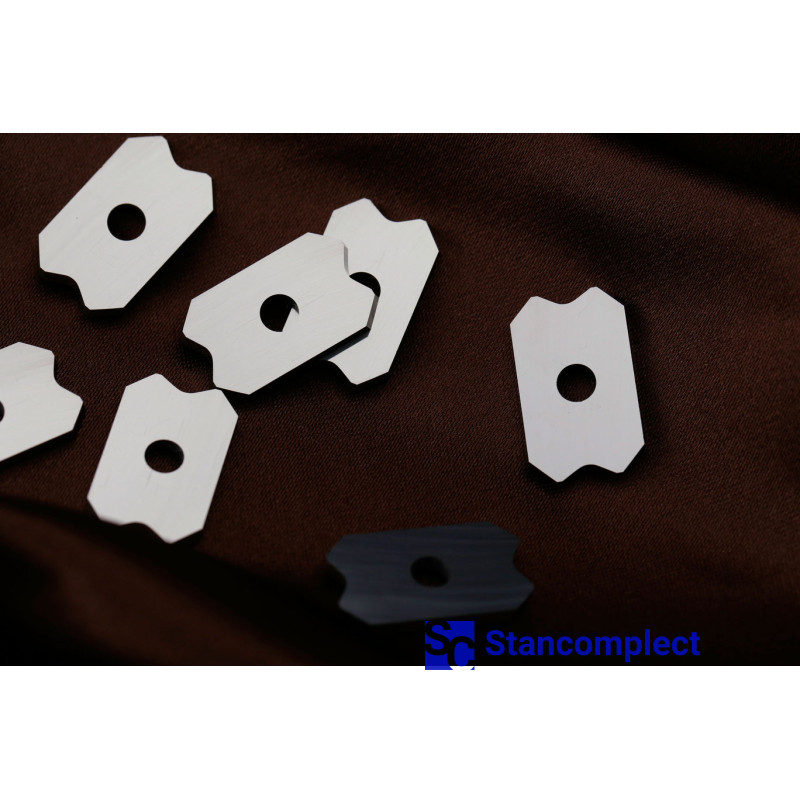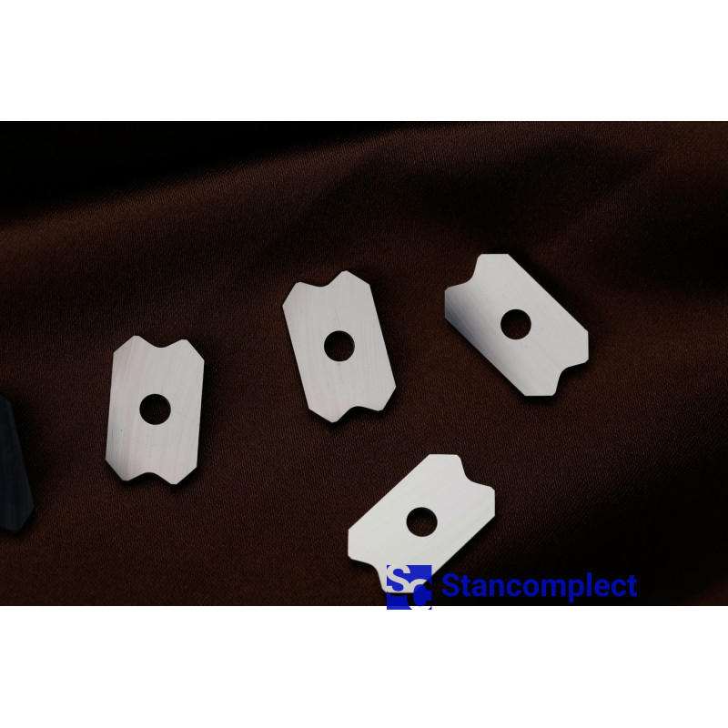 Radius scraper 20x12x2 R2 thickness 2 mm for through-line edge banding machines. Size: L-20 mm, W-12 mm, T-2 mm, D-4 mm, R-2 mm.