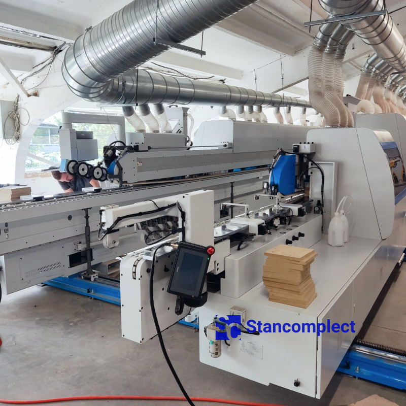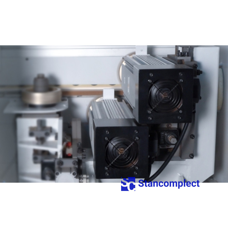 The milling unit consists of two high-frequency electric motors equipped with radius cutters, which allow processing edge material with a thickness of 0.4 - 3.0 mm. The part is tracked using two large round tracers (on each motor) mounted on a floating unit, this design prevents defects during milling. The machine is equipped with two pairs of milling units - 2 roughing units and 2 units for finishing milling of overhangs. Each milling unit is adjusted to two edge thicknesses and switched from the control panel.