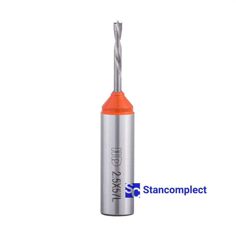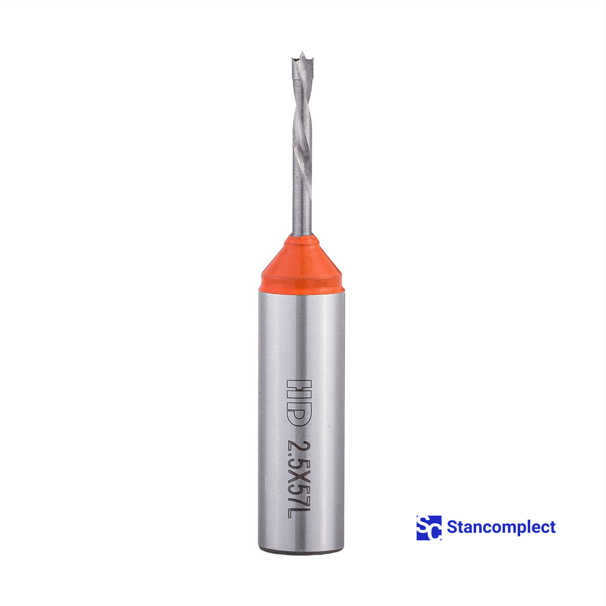 Solid carbide blind hole drill bit HD d-2.5 mm, L-57 mm left (301 series). This drill bit is excellent for drilling blind holes in workpieces made of: MDF, chipboard, chipboard, solid wood, softwood and plywood.