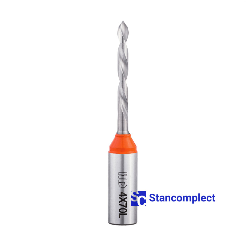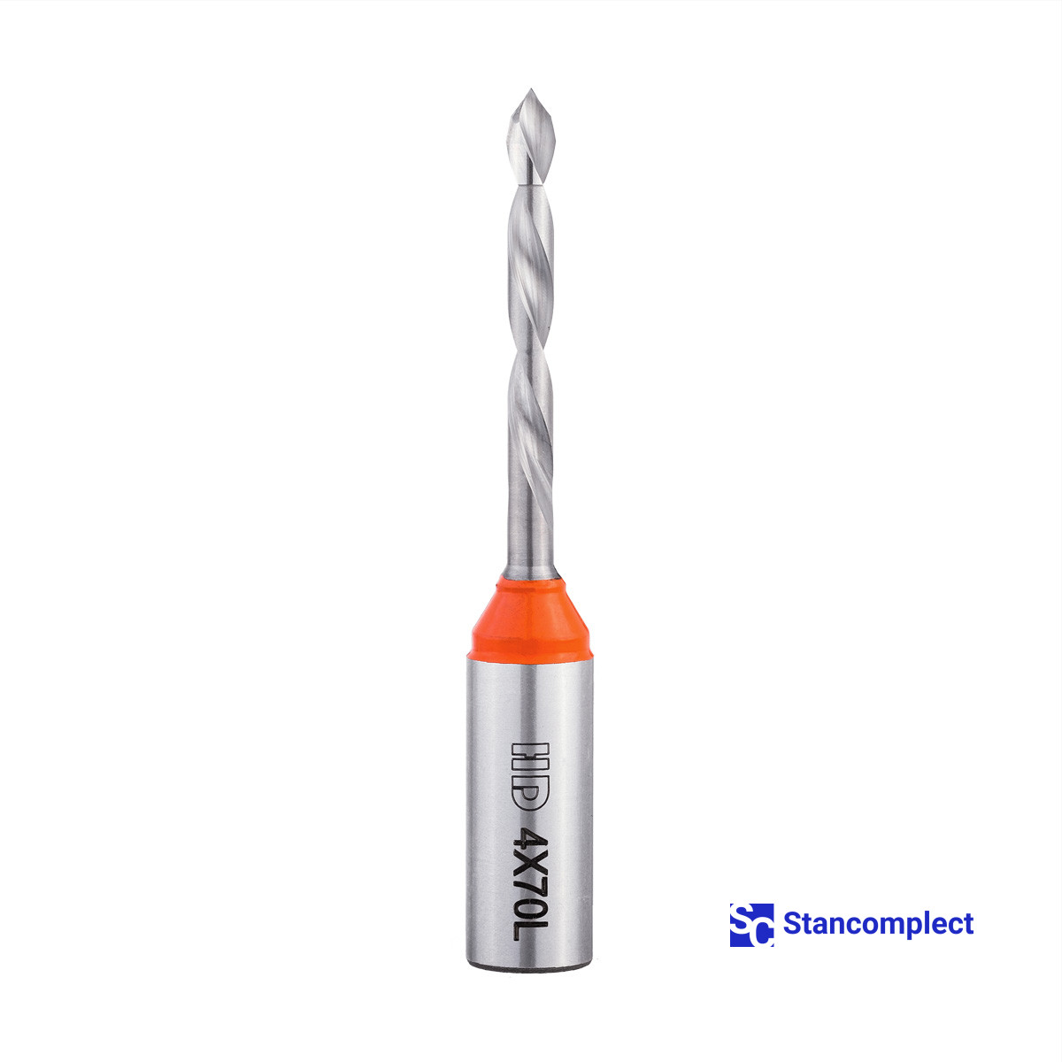 Solid carbide through hole drill bit HD d-4 mm, L-70 mm left (501 series). This drill bit is great for drilling through holes in workpieces made of: MDF, chipboard, chipboard, solid wood, softwood and plywood.