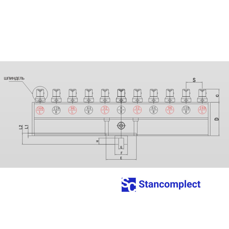 Multi-spindle drilling head with 21 spindles for Chinese drilling machines. The standard distance between spindles is 32 mm. Maximum speed - 4500 rpm.