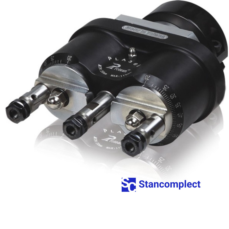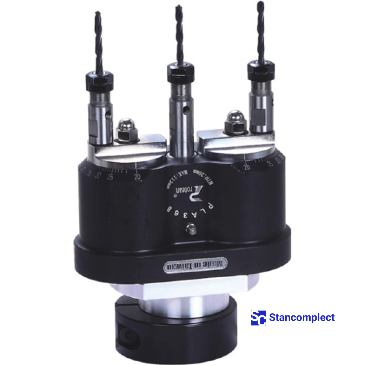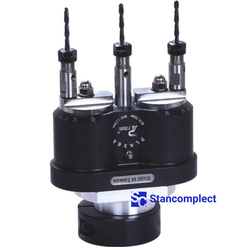 3-spindle drilling head for metal with adjustable spindle spacing 20–112 mm.