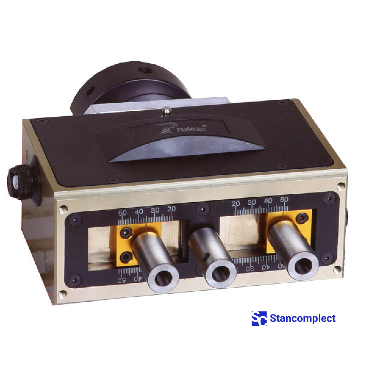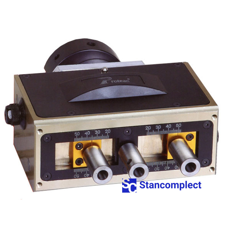 3-spindle drilling head with adjustable spindle spacing 20–100 mm. The spindles are arranged in a single row and can be adjusted relative to the central spindle.