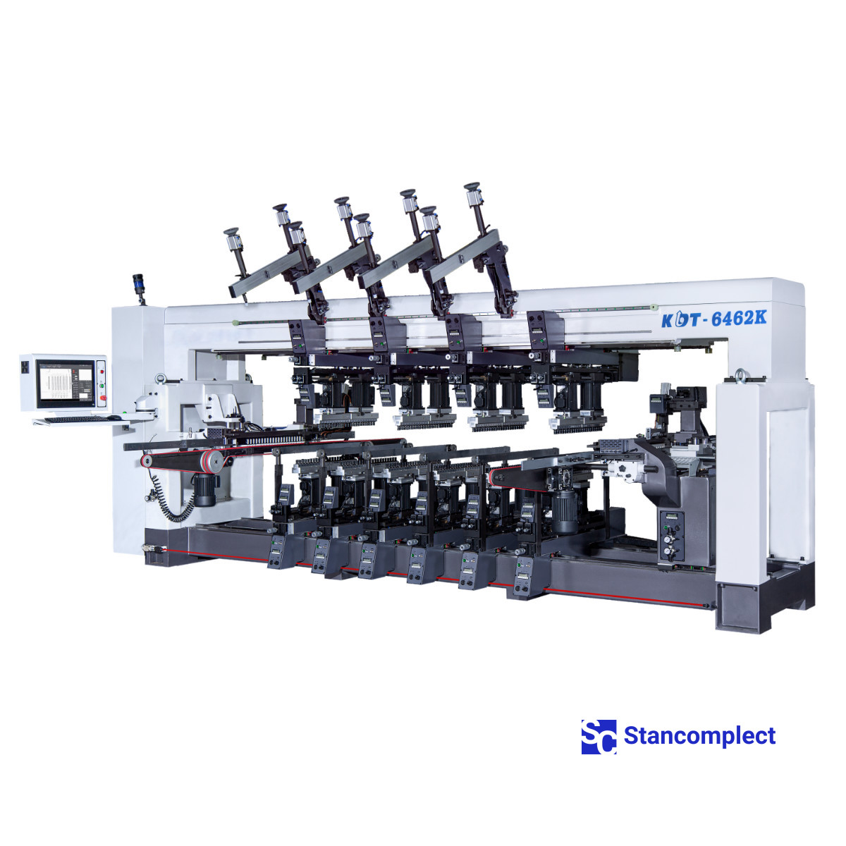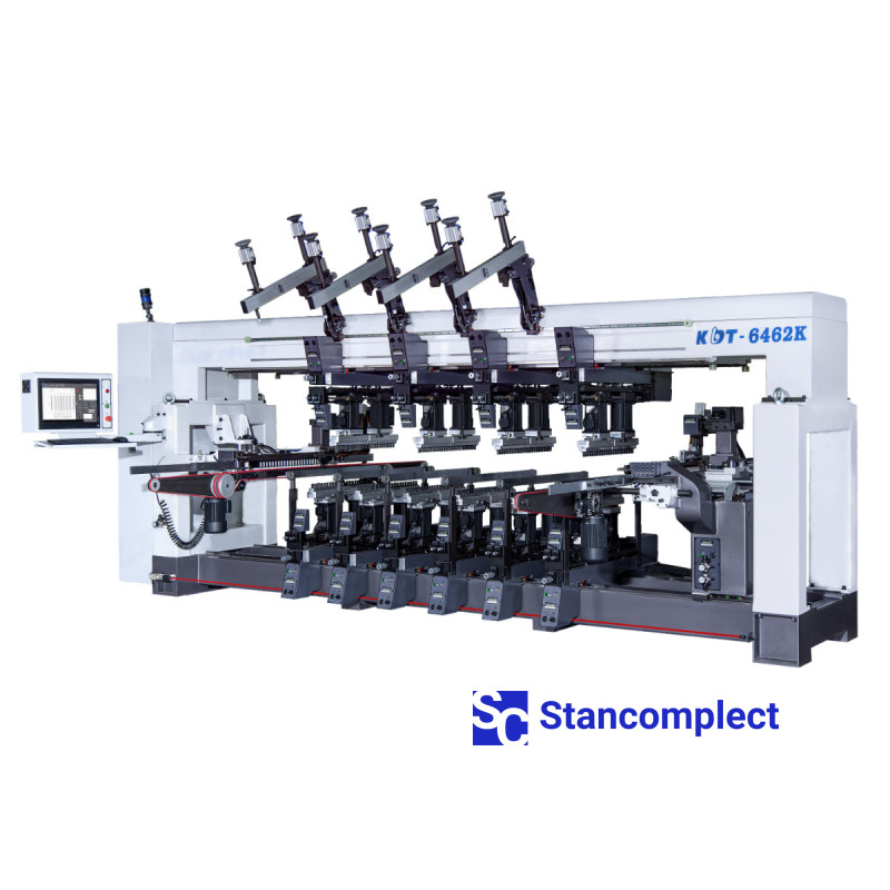 Automatic drilling machine KDT-6462K with PC, auto-resetting and servo drives for 8 vertical groups + 2 horizontal for drilling from 4 sides from KDT Machinery is used for drilling the necessary mounting holes in cabinet furniture parts in furniture factories and workshops .