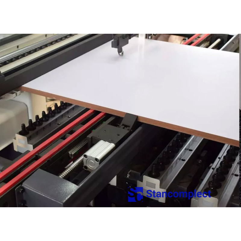 Pneumatic cylinders have the ability to move to adjust to the size of the workpiece, thereby reliably and accurately fix the workpiece in the working area. An additional pair of pneumatic cylinders with the possibility of perpendicular movement is also installed on the machine.