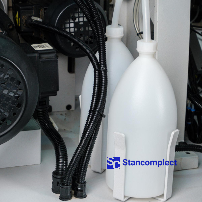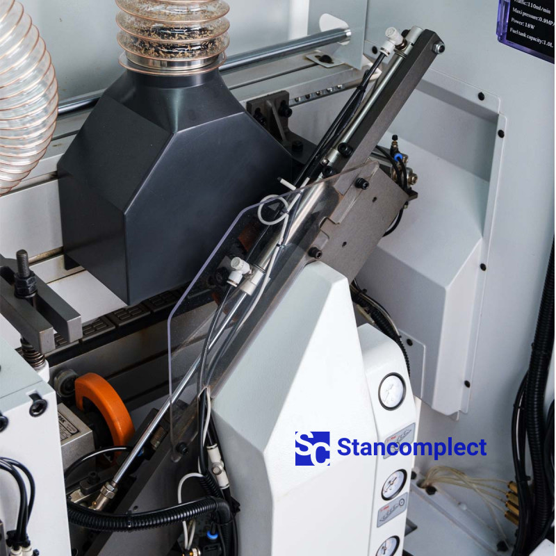 - The first unit for applying the separating liquid: with the help of 2 nozzles in front of the pre-milling unit (milling) of the workpiece. This is done by applying a special separating liquid, so that the glue residues that come out do not come into contact with the workpiece.
