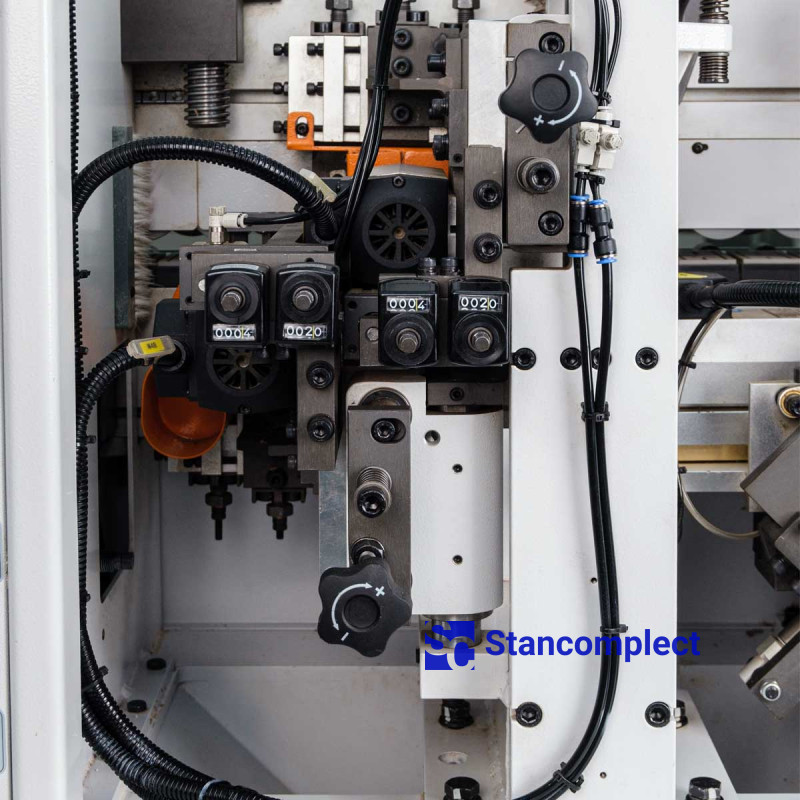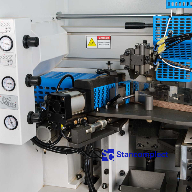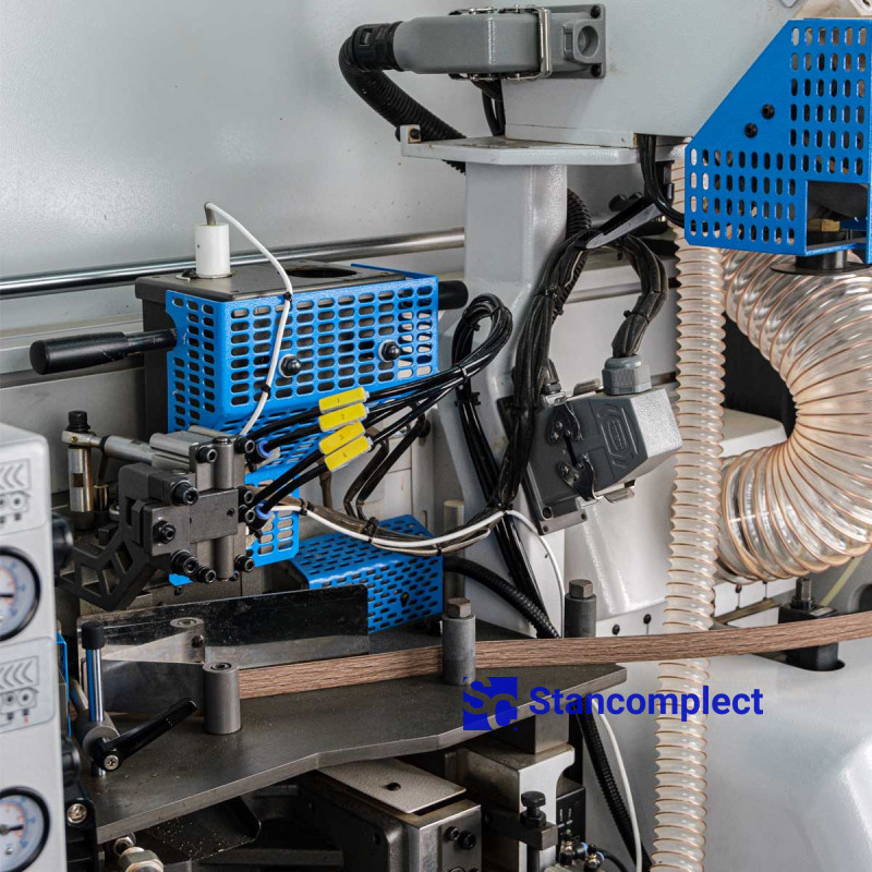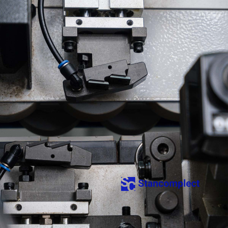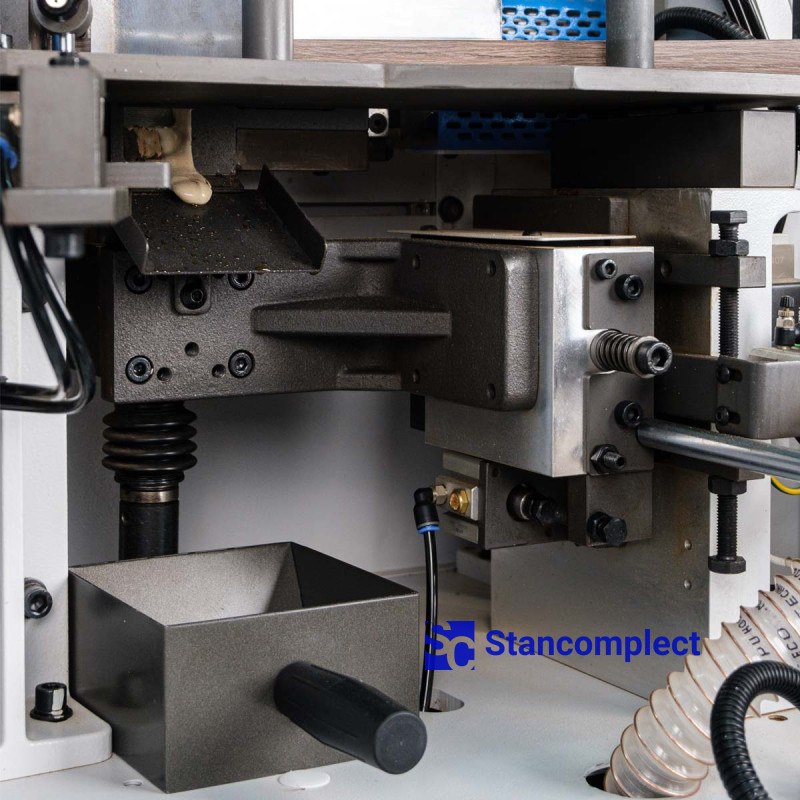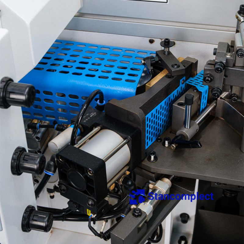 The pressing unit consists of 3 rollers, which are driven by pneumatics, which guarantees an even distribution of forces on the edge during gluing. The powerful pneumatic cylinder of the pre-cutting knife handles the thick edge well. The rollers are equipped with a glue cleaning mechanism. The unit can be reconfigured for a different edge thickness using the machine control panel.