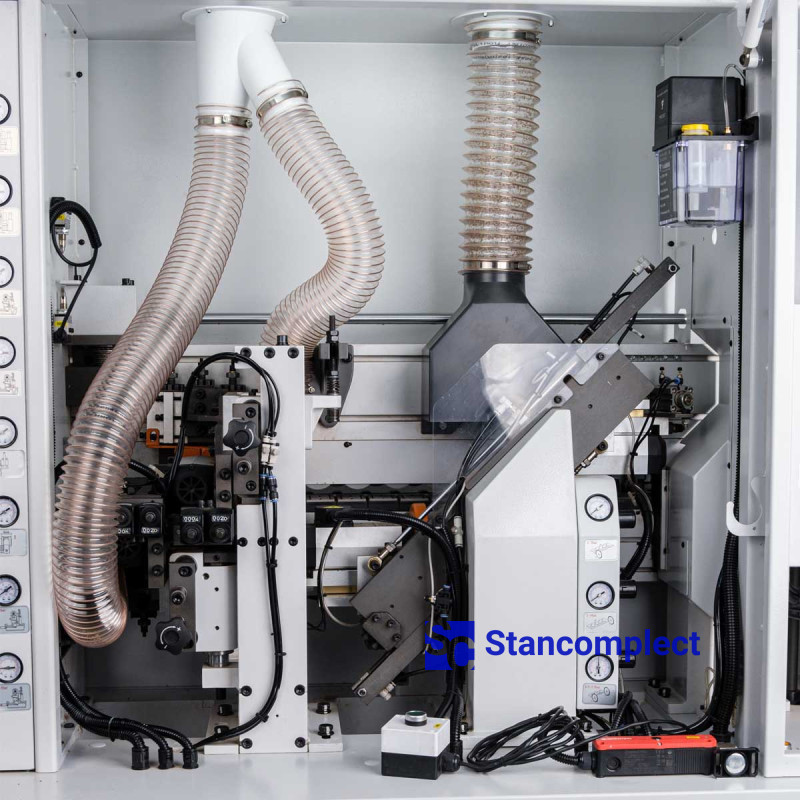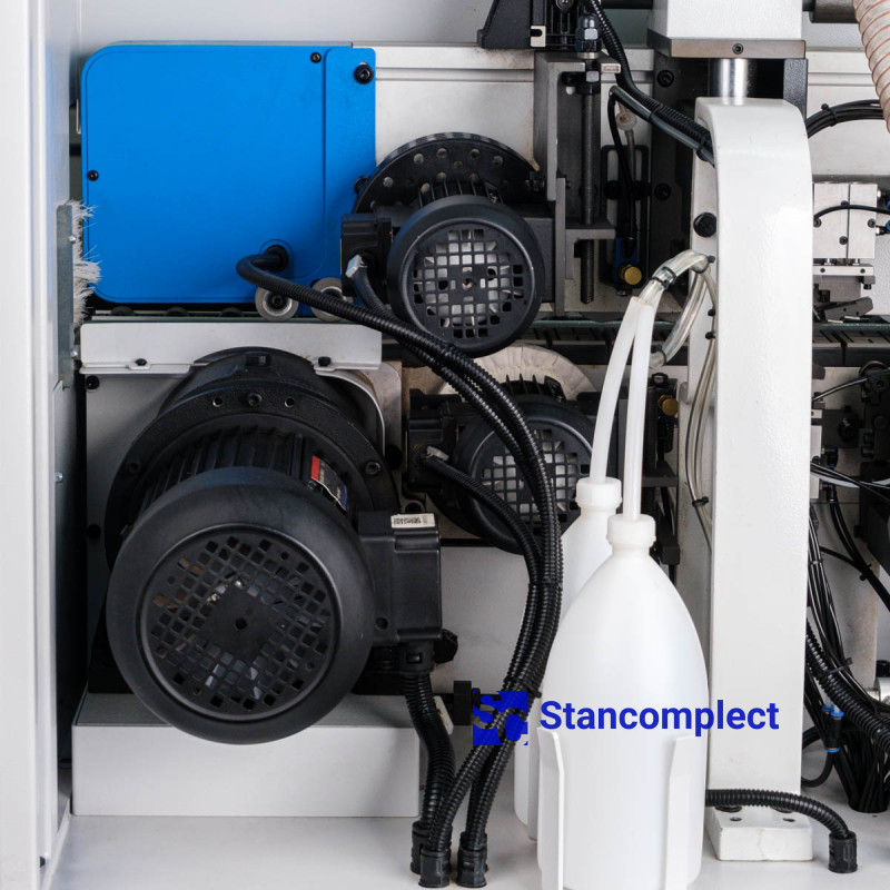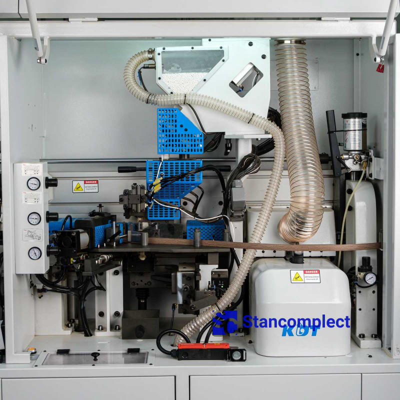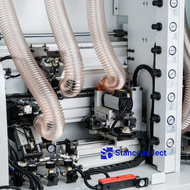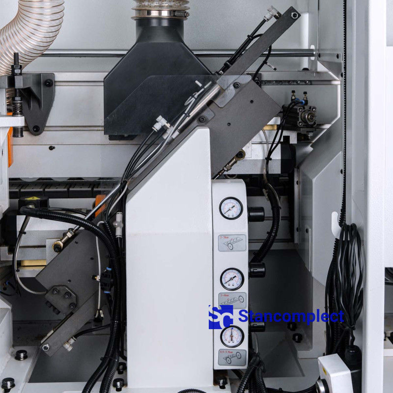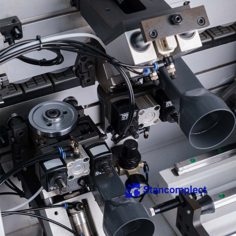 The pressing unit consists of 3 rollers, which are driven by pneumatics, which guarantees an even distribution of forces on the edge during gluing. The powerful pneumatic cylinder of the pre-cutting knife handles the thick edge well. The rollers are equipped with a glue cleaning mechanism. The unit can be reconfigured for a different edge thickness using the machine control panel.