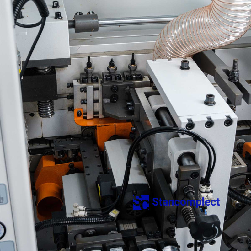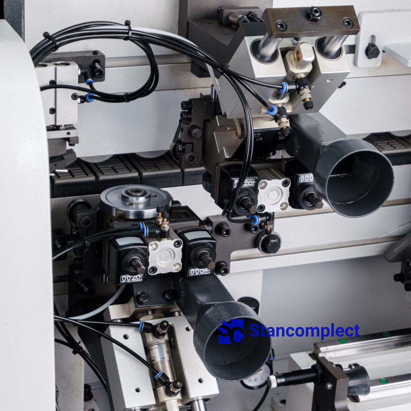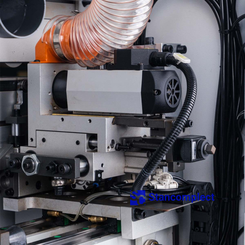 The end trimming unit is equipped with two high-frequency electric motors, and the movement of the saw units is carried out along special linear guides. The unit is equipped with an automatic lubrication system for the guides, as well as its own aspiration nozzle. The unit is reconfigured between different processing angles of 2° and 15° from the machine control panel.