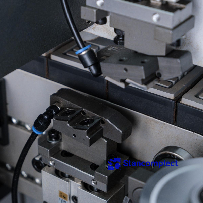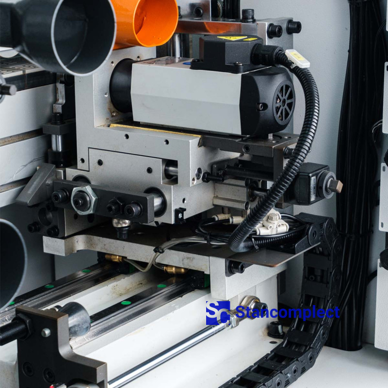 The milling unit consists of two high-frequency electric motors equipped with radius cutters, which allow processing edge material with a thickness of 0.4 - 3.0 mm. The part is tracked by two large round cams (on each motor) mounted on a floating assembly, this design prevents scrap during milling.