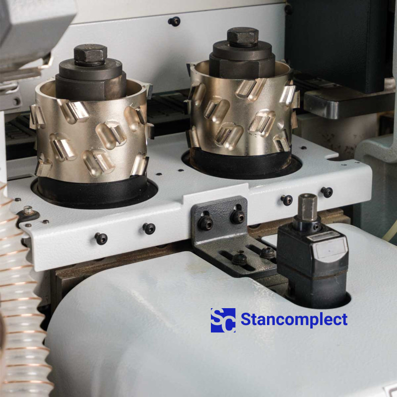The radius scrapping unit is equipped with two carbide radius knives, which, after milling the edge, remove a thin layer from the milled part of the edge and remove the kinematic wave, as a result we get a smooth machined surface. The scraping unit is equipped with a mechanism for separating chips from the workpiece after scraping.