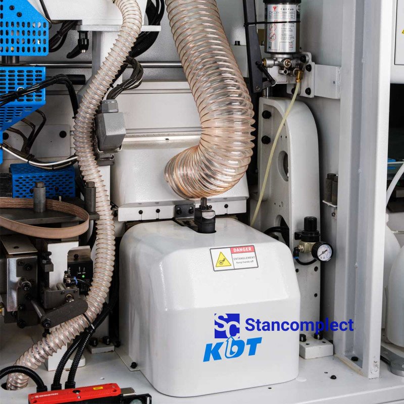 The machine is equipped with automatic pneumatic loading of granulated glue. At the bottom of the machine bed there is a large 12.5 kg hopper from which, through the air flow, the granules are transported to the upper hopper with pre-melt.