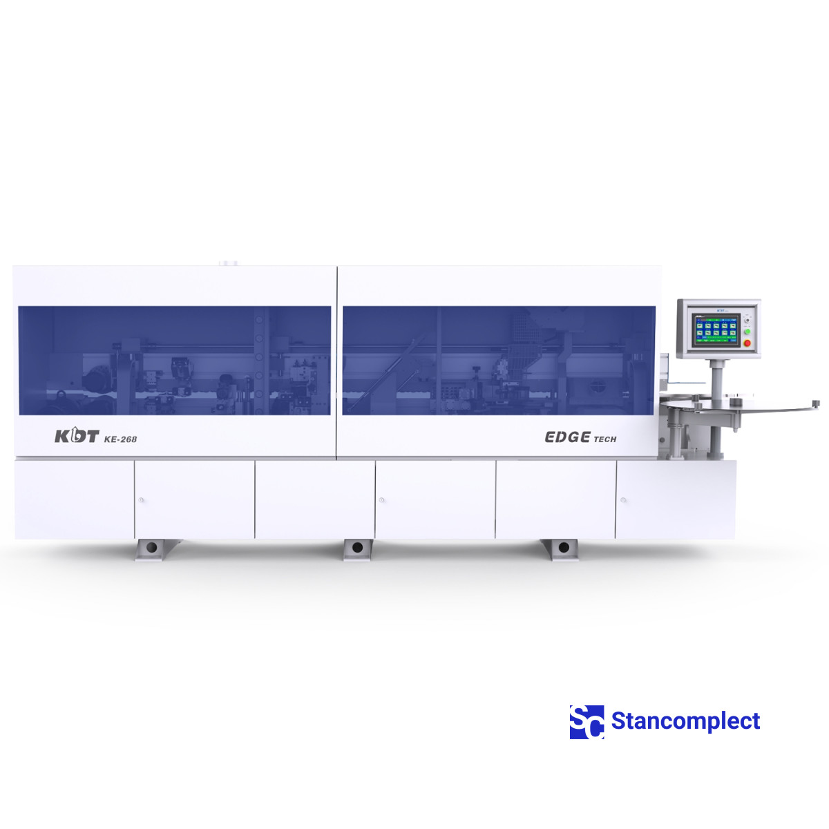 KE-268JSA automatic feed-through edge banding machine with corner rounding unit, upper glue bath for EVA/PUR glue and pneumatic reconfiguration of units from KDT MACHINERY is designed for simultaneous gluing of straight edges of furniture boards and blanks with synthetic roll material.