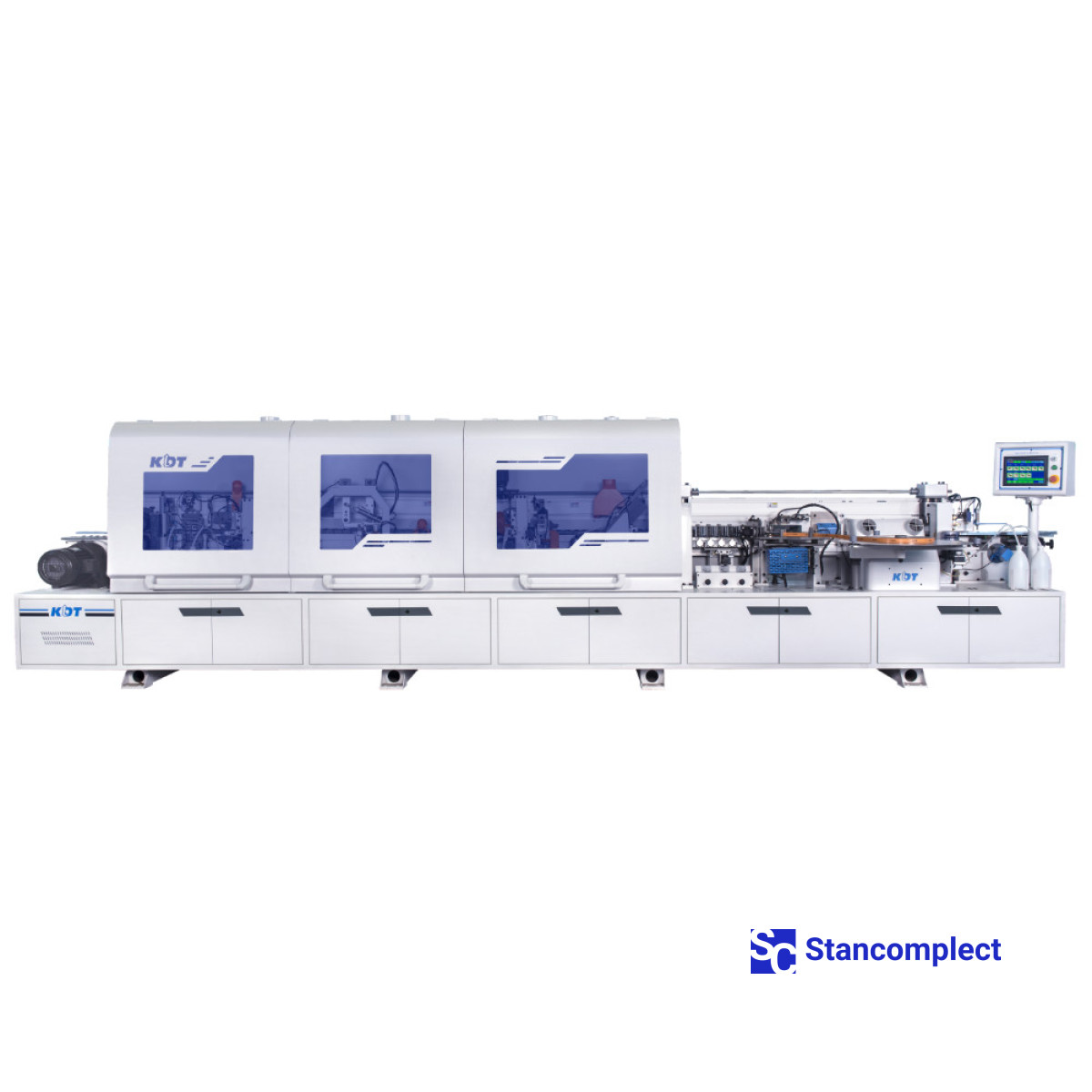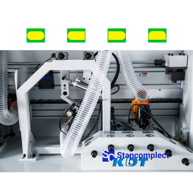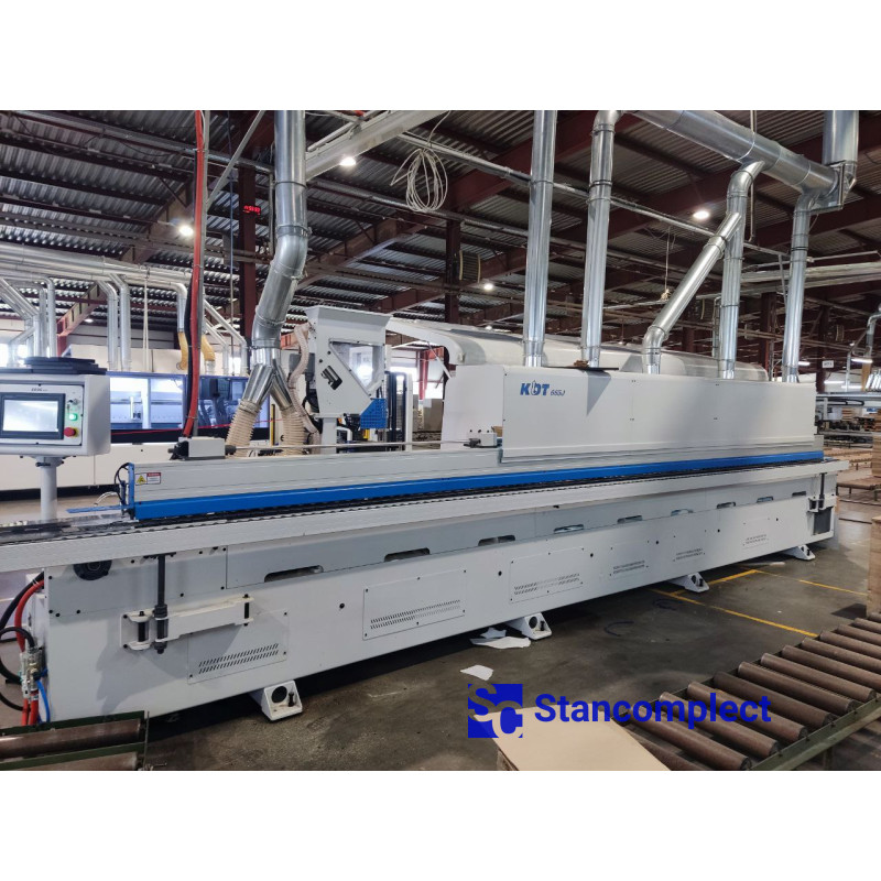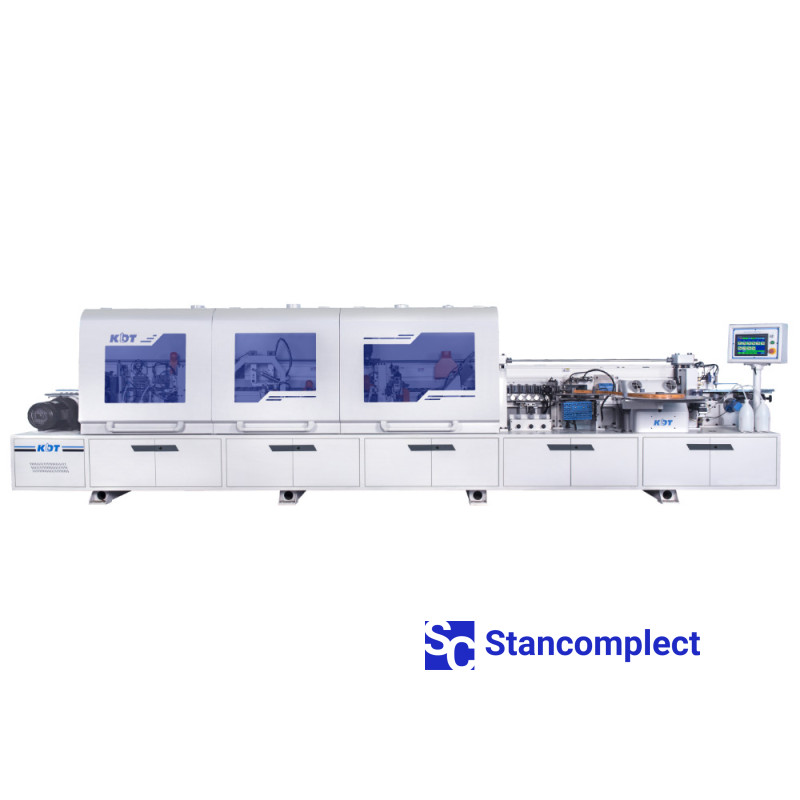 The KE-665JSA automatic edge banding machine with top glue pot without pre-melt, contouring unit (rounds), jointing, adhesive cycles and pneumatic reconfiguration of units from KDT MACHINERY is designed for simultaneous gluing of straight edges of furniture boards and blanks with synthetic roll material.