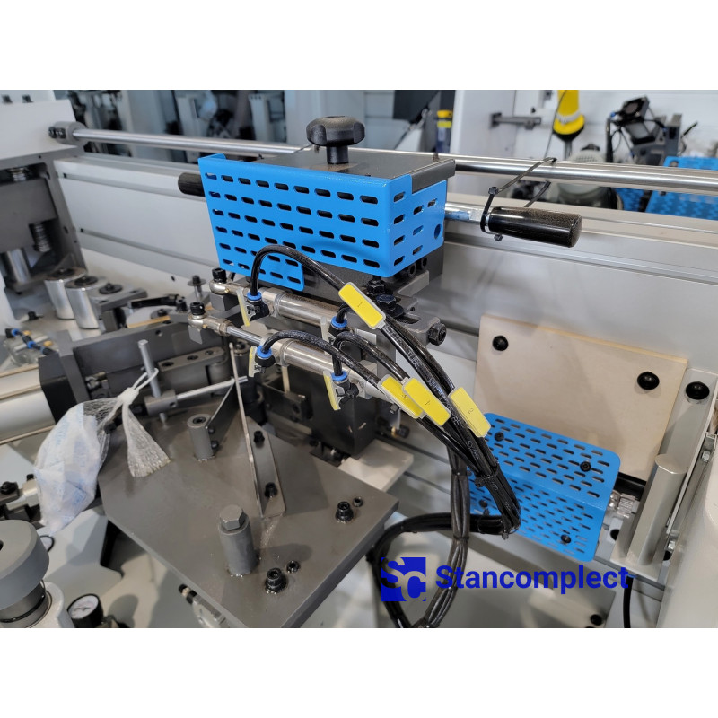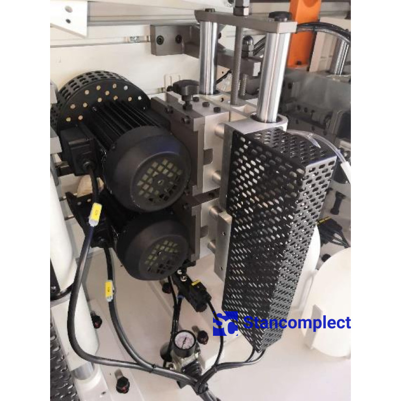 The pressing unit consists of 5 rollers , which are driven by pneumatics, which guarantees an even distribution of forces on the edge during gluing. Of the 4 rollers, 2 rollers have a different cone, which ensures the distribution of the clamping force over the thickness of the part. 2 cylindrical rollers apply pressure throughout the thickness of the part, and 3 conical rollers are concentrated on the lower and upper parts of the part. The powerful pneumatic cylinder of the pre-cutting knife handles the thick edge well. The rollers are equipped with a glue cleaning mechanism.