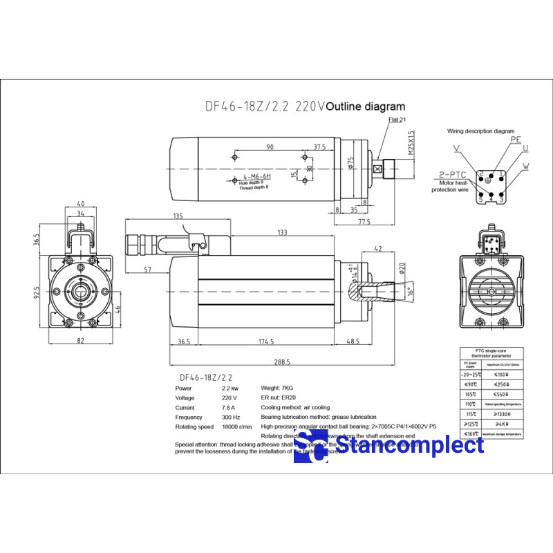 High-speed air-cooled electrospindle with a power of 2.2 kW and a maximum speed of up to 18,000 rpm for CNC machining centers and CNC drilling centers.