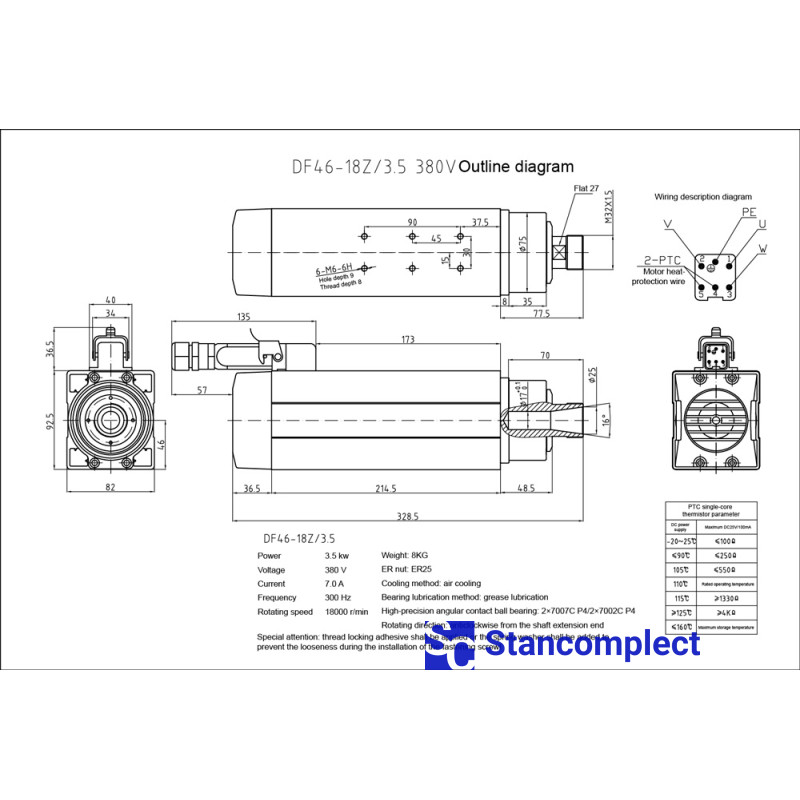 Air-cooled high-speed electrospindle with a power of 3.5 kW and a maximum speed of up to 18,000 rpm for CNC machining centers and CNC drilling centers.