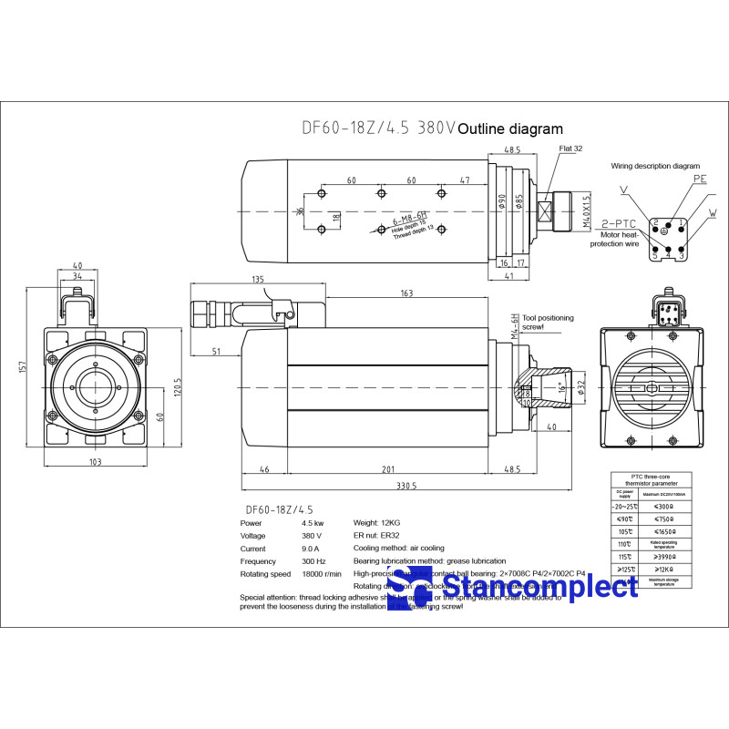 High-speed air-cooled electrospindle with a power of 4.5 kW and a maximum speed of up to 18,000 rpm for CNC machining centers and CNC drilling centers.