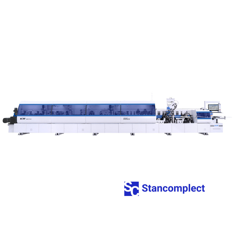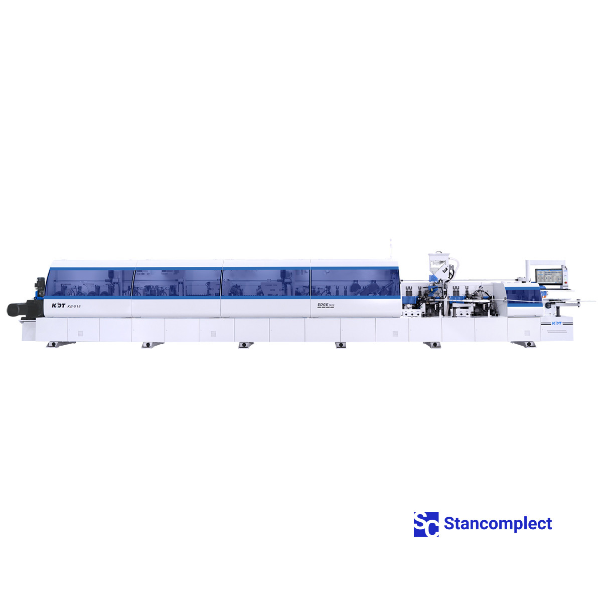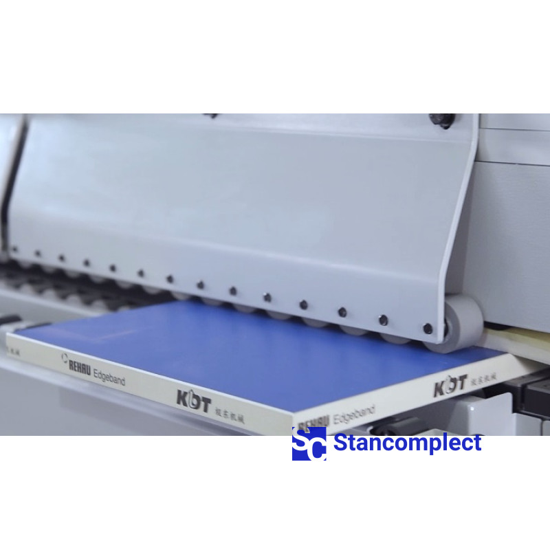 The KE-518B high-speed automatic edgebanding machine of the pass-through type with a PC, upper glue baths for EVA/PUR glue, a contouring unit and double milling, scraping and polishing units from KDT MACHINERY is designed for simultaneous lining of straight edges of furniture panels and blanks with synthetic roll material.